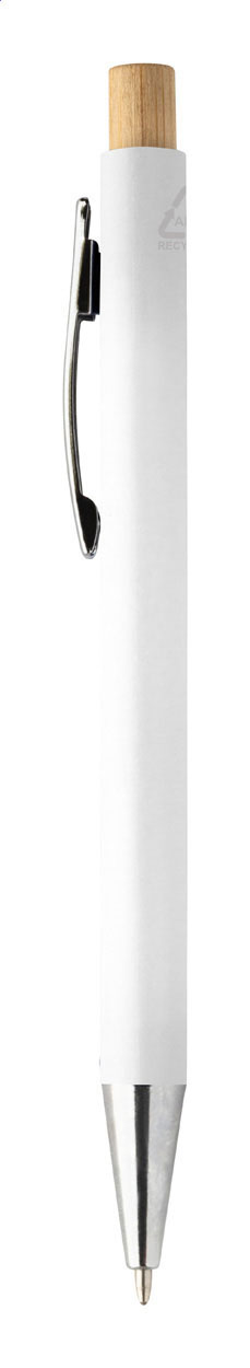 Kuličkové pero z recyklovaného ABS plastu s bambusovým tlačítkem a kovovým klipem. S modrou náplní.