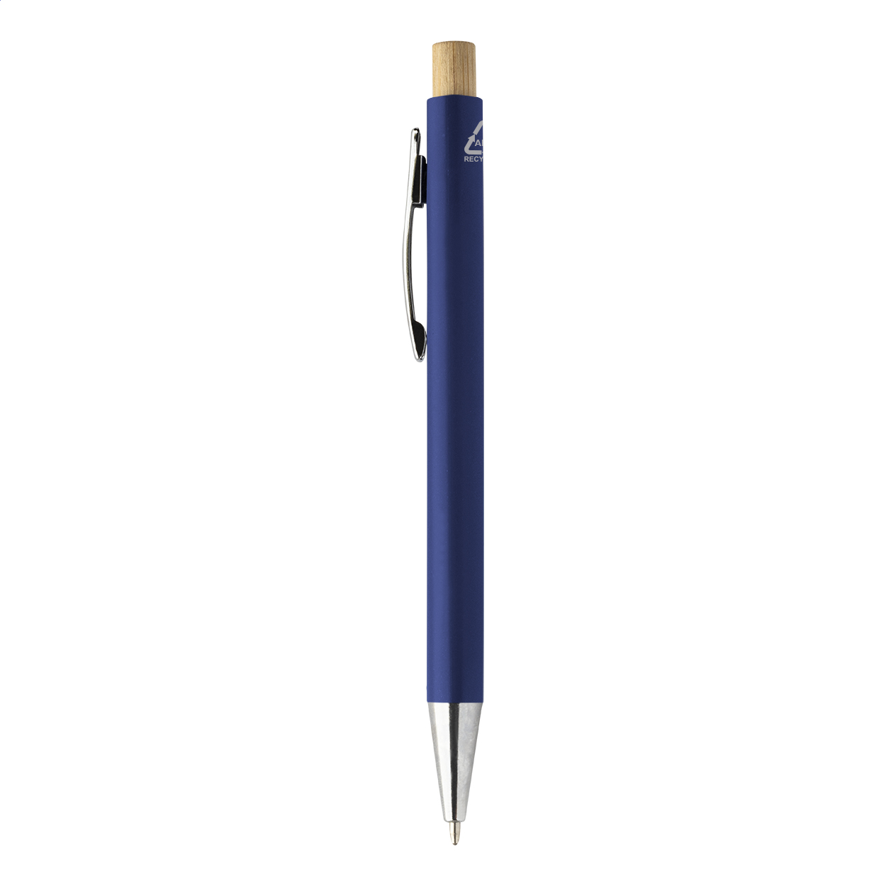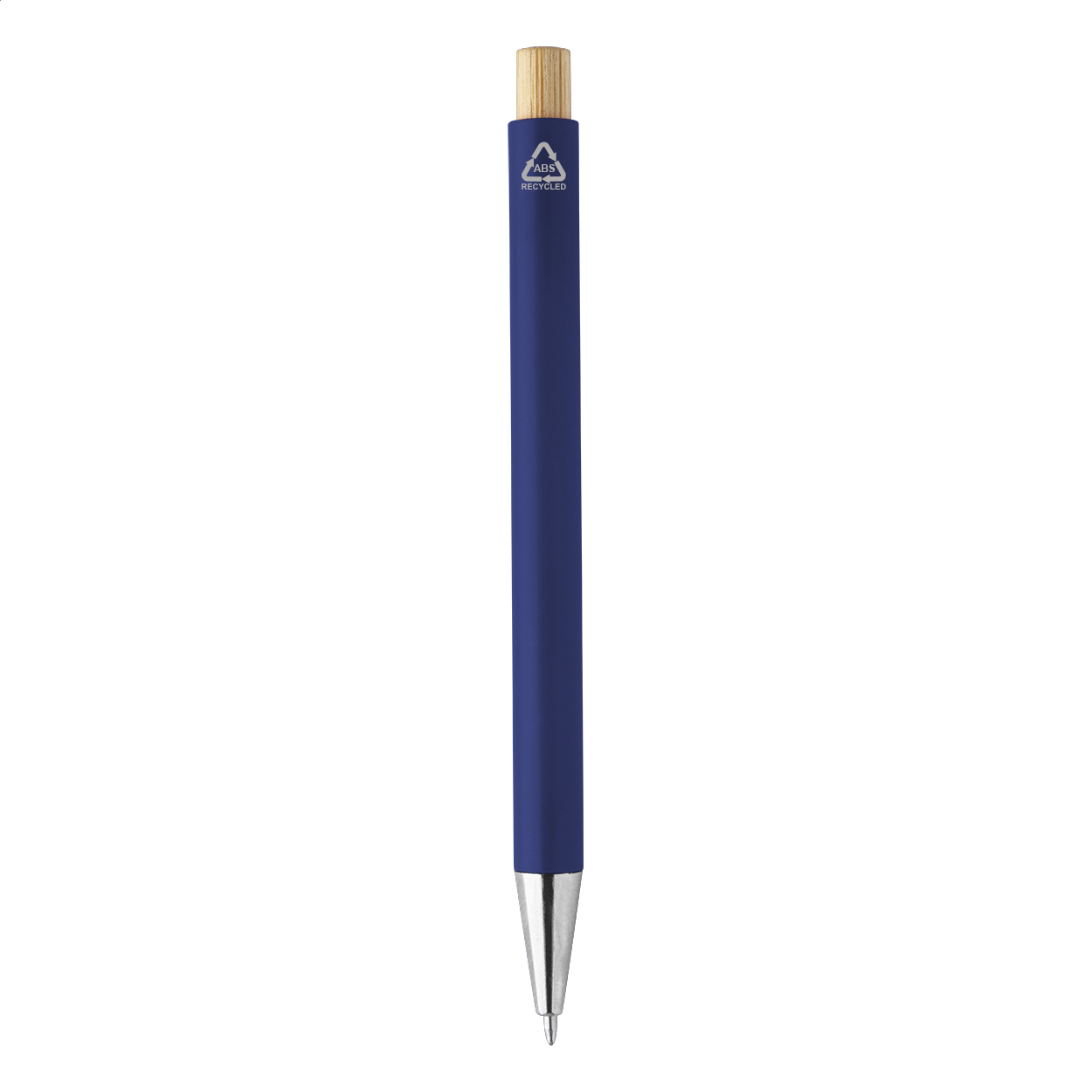 Kuličkové pero z recyklovaného ABS plastu s bambusovým tlačítkem a kovovým klipem. S modrou náplní.