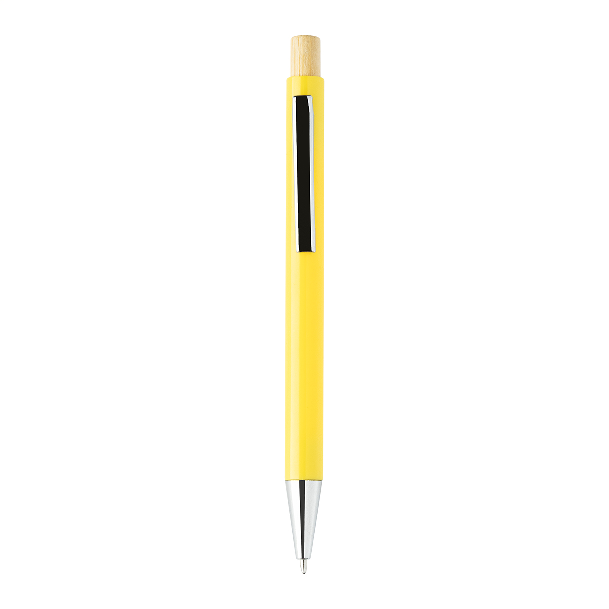 Kuličkové pero z recyklovaného ABS plastu s bambusovým tlačítkem a kovovým klipem. S modrou náplní.
