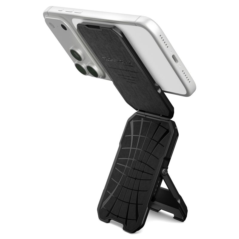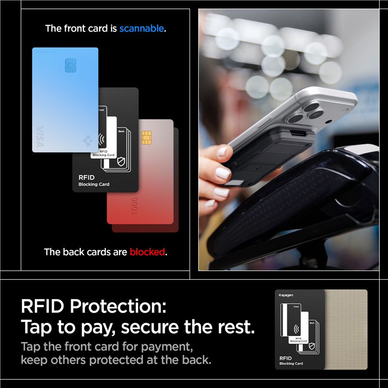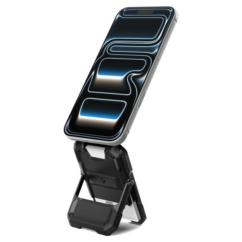 Chrání soukromí pomocí RFID odstínění, přičemž dovoluje bezkontaktní platbu přední kartou bez nutnosti jejího vyjímání. Integrovaný výklopný stojánek zajišťuje stabilní oporu pro telefon v optimálním úhlu, zatímco výřez pro palec zrychluje přístup k dokladům.