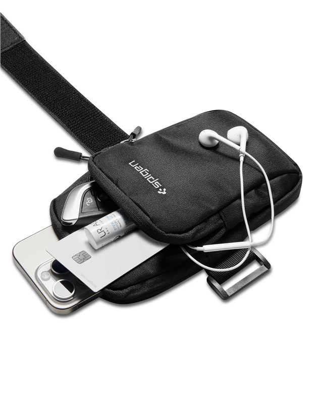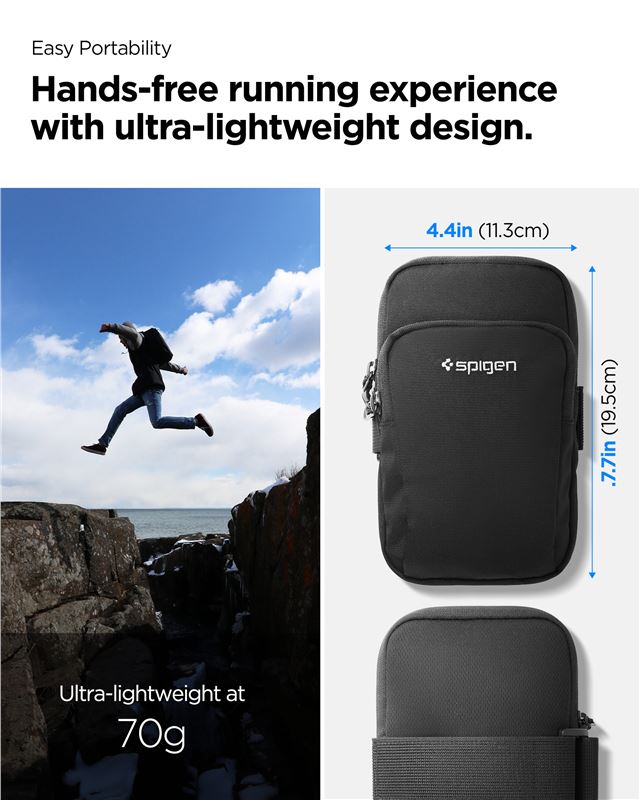 Obsahuje dvě oddělené kapsy, které pojmou mobilní telefon, klíče, platební karty i sluchátka, čímž udržuje ruce zcela volné. Použitý neoprenový materiál efektivně odpuzuje pot a lehký déšť, přičemž vyniká schopností rychlého schnutí a snadnou údržbou.