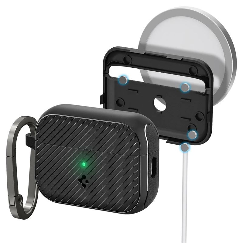 Prémiové pouzdro Spigen Mag Armor MagSafe v černém provedení obsahuje silné magnety pro precizní spolupráci s ekosystémem MagSafe. Dvouvrstvá hybridní technologie spojuje pevný polykarbonát a ohebný TPU, čímž vytváří nekompromisní ochranu AirPods Pro 2 před pády a poškrábáním. Integrovaná lepicí páska uvnitř zajišťuje, že kryt na sluchátkách sedí naprosto pevně.