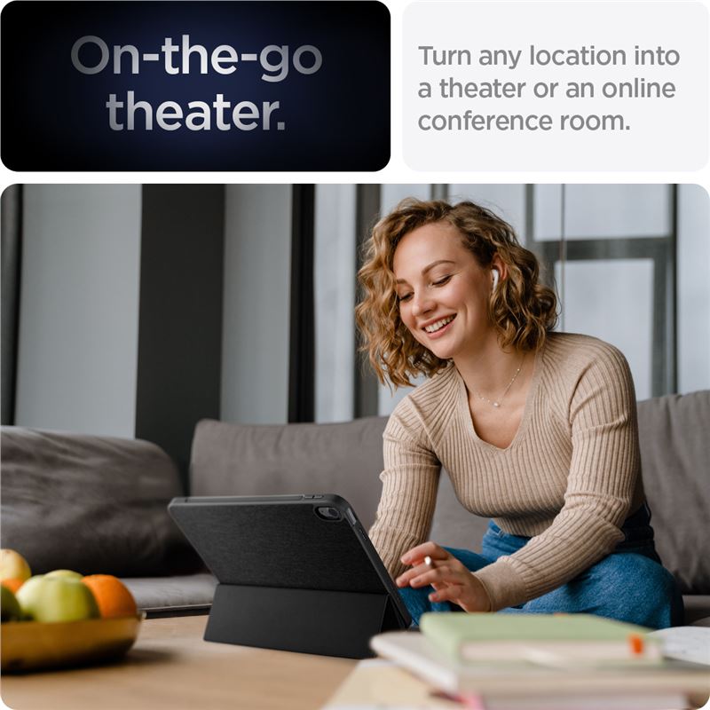 Zabraňuje poškození hran i plochy displeje a disponuje vyhrazeným prostorem pro bezpečné uložení Apple Pencil. Konstrukce dovoluje složení do polohy stojánku, což usnadňuje videohovory nebo prohlížení obsahu bez nutnosti držet zařízení v rukou.