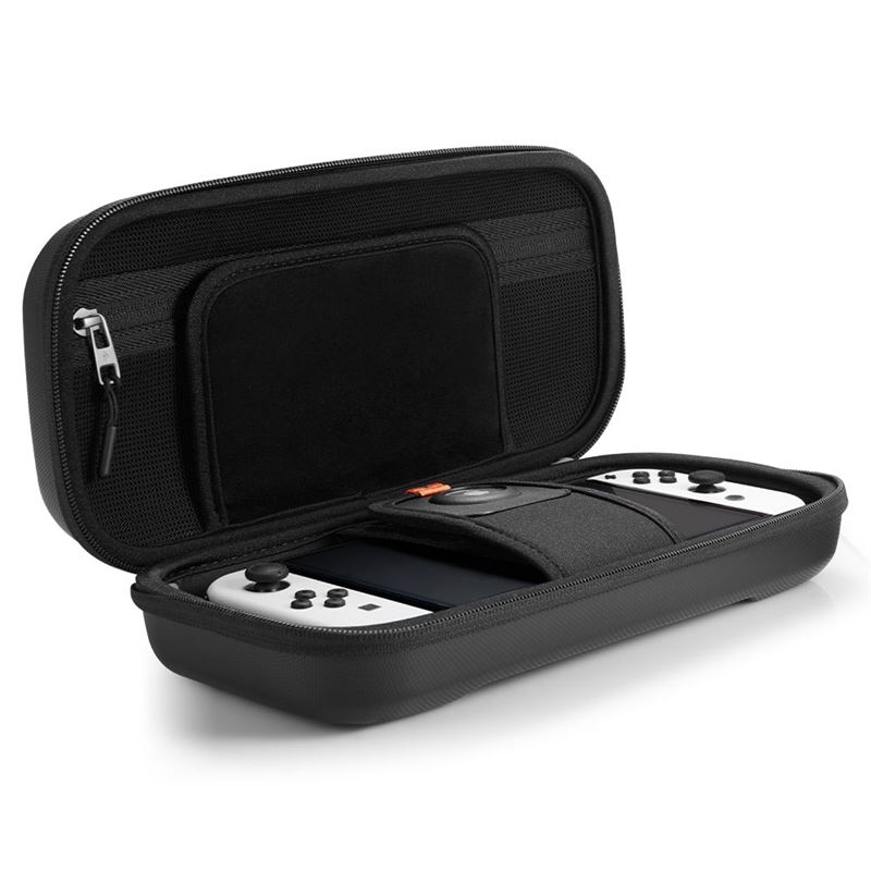Odolné cestovní pouzdro bezpečně pojme herní konzoli Nintendo Switch nebo Switch OLED i s nezbytnou výbavou. Vnitřní uspořádání obsahuje držák pro 10 herních kazet a vyhrazené místo pro Joy-Cony, nabíječku i kabely.