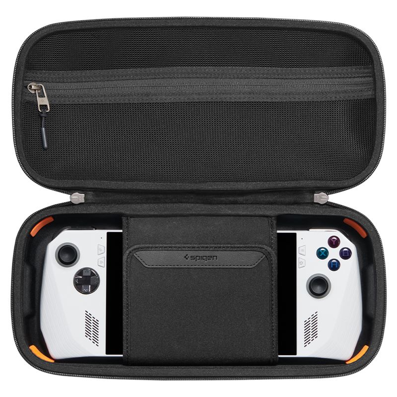 Vyztužené pouzdro z PU, EVA pěny a nylonu zajišťuje nekompromisní ochranu herní konzole ROG Ally X nebo ROG Ally 2023. Oranžové polstrování v rozích zvyšuje odolnost proti pádu, zatímco semišová podšívka brání poškrábání displeje.