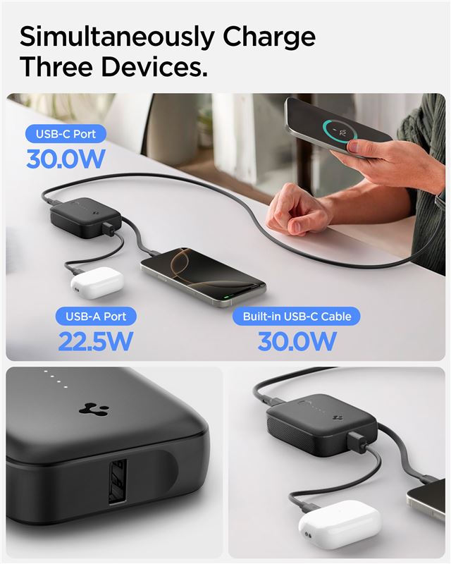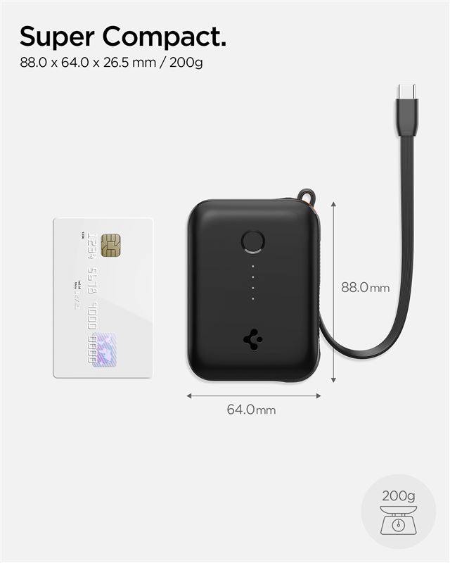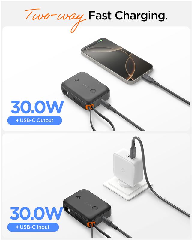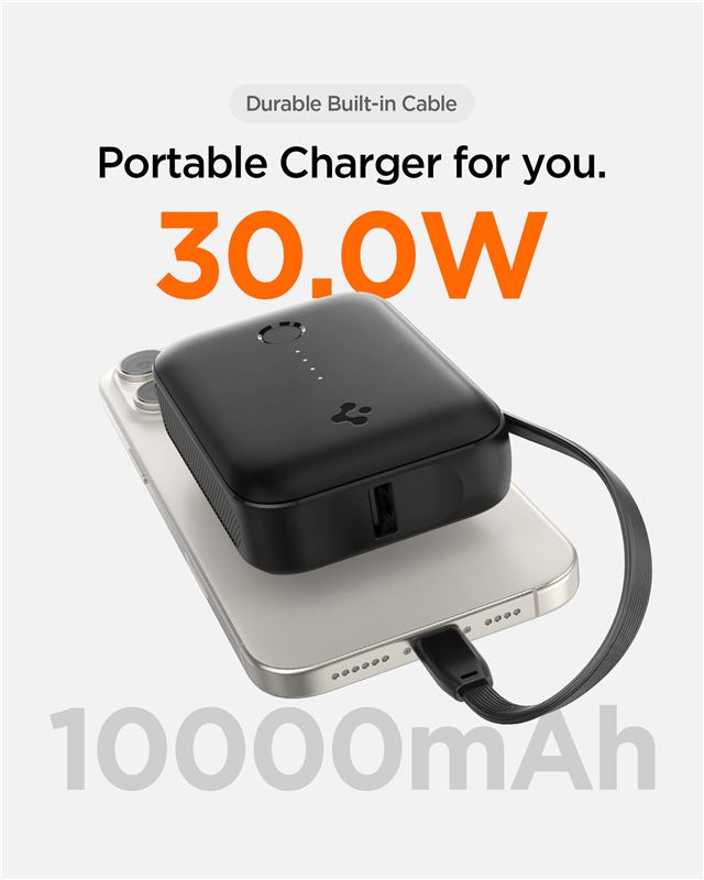 Kompaktní powerbanka Spigen Essential s kapacitou 10 000 mAh disponuje integrovaným USB-C kabelem, který eliminuje potřebu nosit další příslušenství. Vysoký výkon 30 W umožňuje rychlé nabíjení nejen chytrých telefonů, ale také energeticky náročnějších tabletů, čímž šetří drahocenný čas na cestách.