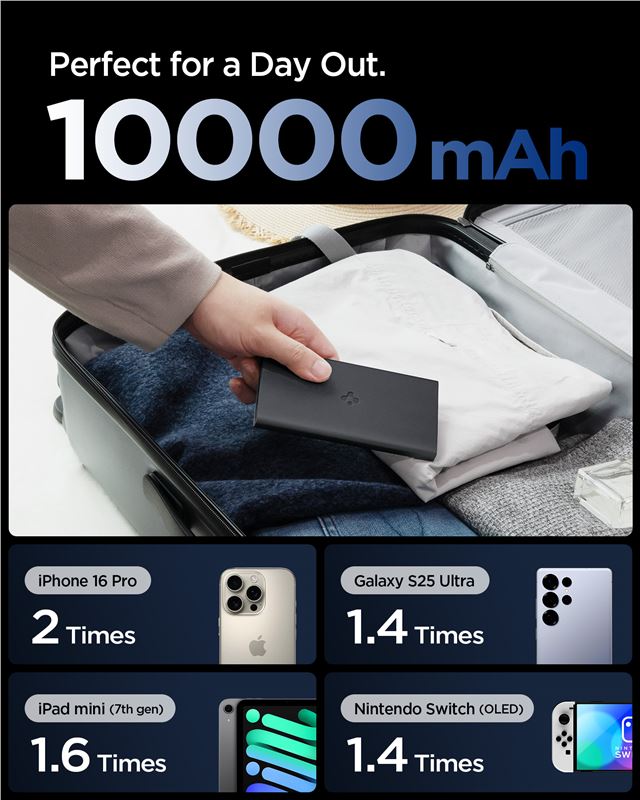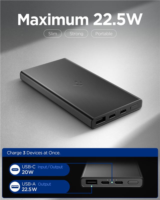 Štíhlá černá powerbanka Spigen Essential s kapacitou 10 000 mAh představuje spolehlivý záložní zdroj energie pro opakované nabíjení mobilního telefonu. Výkon 22,5 W zaručuje svižné doplnění kapacity akumulátoru u smartphonů i menších tabletů, a to i při zapojení až tří zařízení současně do portů USB-C a USB-A.