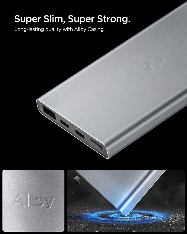 Výkonný externí zdroj energie v šedém hliníkovém a polykarbonátovém těle s tloušťkou pouhých 10 mm. Kapacita 10 000 mAh a maximální výkon 22,5 W zvládnou spolehlivě dobít smartphone i náročnější tablety během cestování.