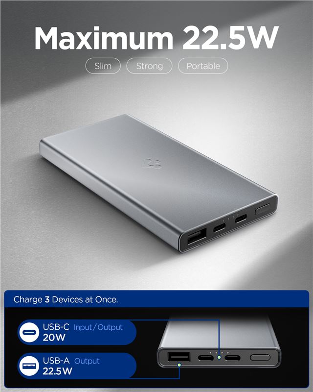 Nabíjí až tři zařízení současně pomocí dvou portů USB-C a jednoho konektoru USB-A. Obsahuje praktické ochranné pouzdro a metrový napájecí kabel USB-C, což usnadňuje bezpečné přenášení v kapse nebo brašně při každodenním používání.