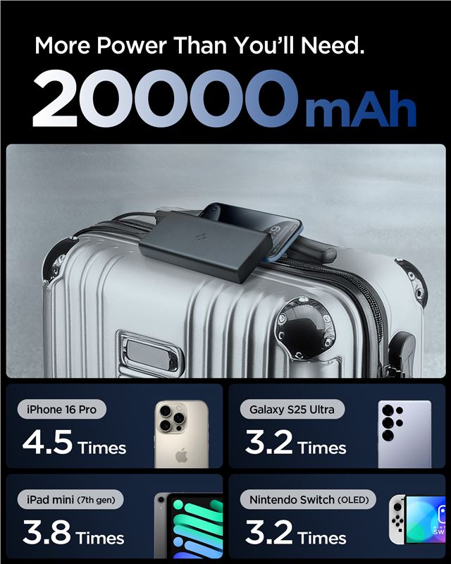 Výkonná externí baterie s kapacitou 20 000 mAh zajišťuje spolehlivý přísun energie pro smartphone i tablet po několik dní. Rychlé 30W nabíjení minimalizuje čas strávený u zásuvky, zatímco hliníkové tělo efektivně odvádí teplo i při maximálním zatížení.