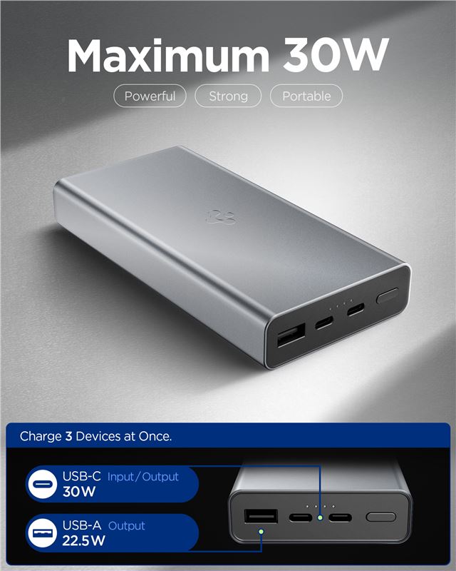Externí baterie v elegantním šedém provedení s kapacitou 20 000 mAh poskytuje dostatek energie pro opakované nabití mobilního telefonu i tabletu. Vysoký výkon 30 W zajišťuje rychlou obnovu kapacity moderní elektroniky a hliníkový obal chrání vnitřní články před mechanickým poškozením.