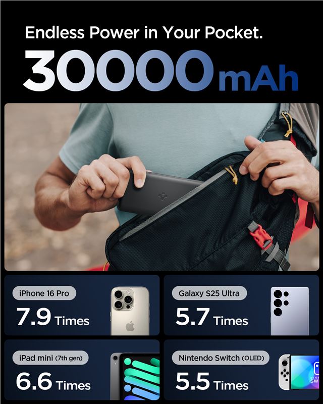 Velkokapacitní externí baterie s kapacitou 30 000 mAh slouží jako spolehlivá energetická rezerva pro vícedenní cesty mimo dosah sítě. Nabíjecí výkon 30 W efektivně napájí chytré telefony i moderní tablety vybavené USB-C konektorem.