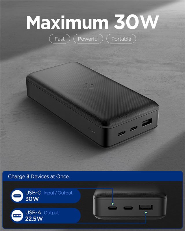 Umožňuje souběžné napájení až tří zařízení prostřednictvím dvou portů USB-C a jednoho USB-A výstupu. Konstrukce z nárazuvzdorného materiálu ABS a polykarbonátu zajišťuje vysokou odolnost, přičemž balení obsahuje metrový USB-C kabel a textilní pouzdro.