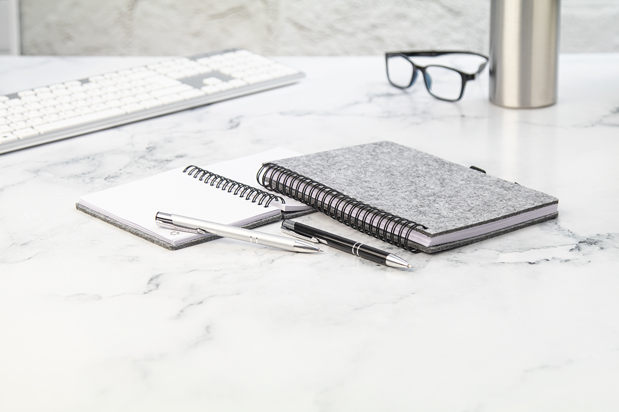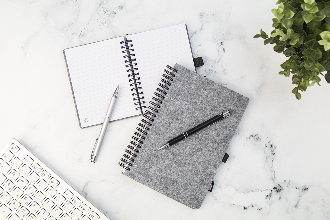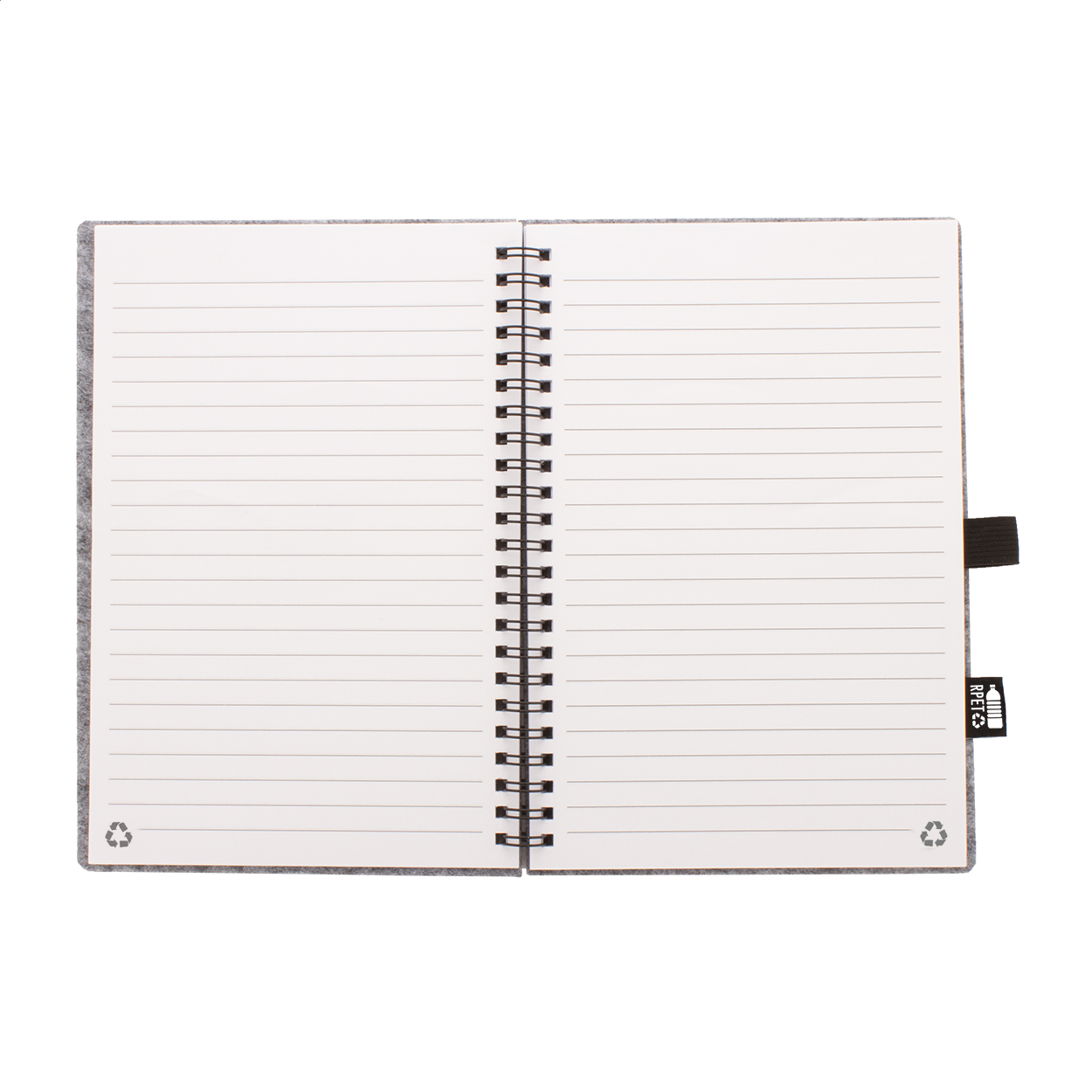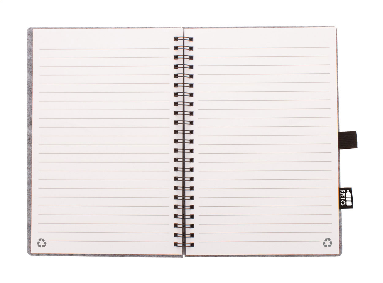 Spirálový blok A5 potažený RPET plstí s výrazným štítkem RPET a 80 linkovanými listy z recyklovaného papíru.