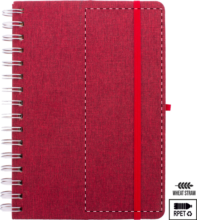 Spirálový blok A5 s deskami potaženými polyesterem RPET s plastovým držákem na mobil a tablet z pšeničné slámy. Se 70 linkovanými listy z recyklovaného kraftového papíru, gumičkou a držákem na pero.