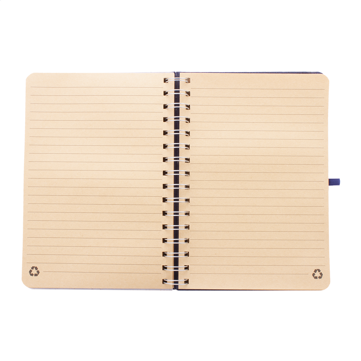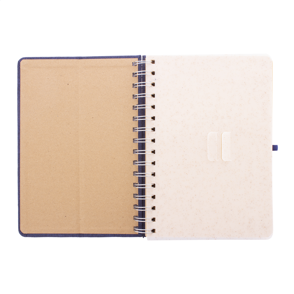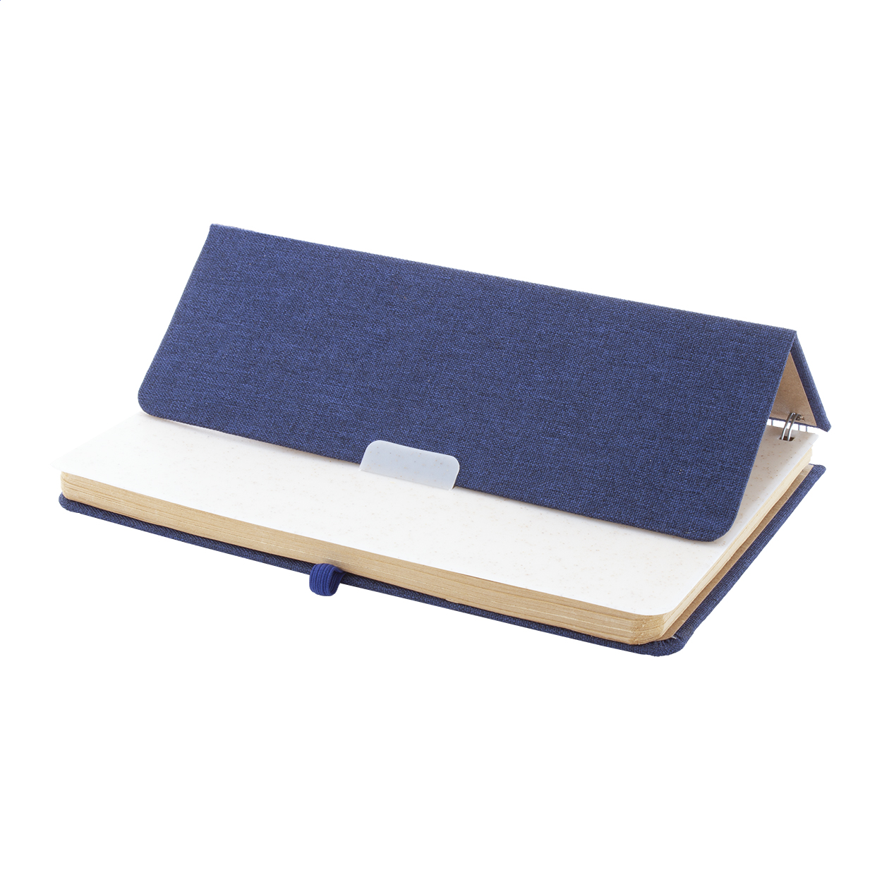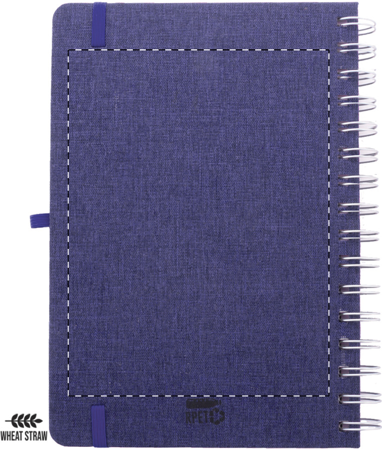 Spirálový blok A5 s deskami potaženými polyesterem RPET s plastovým držákem na mobil a tablet z pšeničné slámy. Se 70 linkovanými listy z recyklovaného kraftového papíru, gumičkou a držákem na pero.