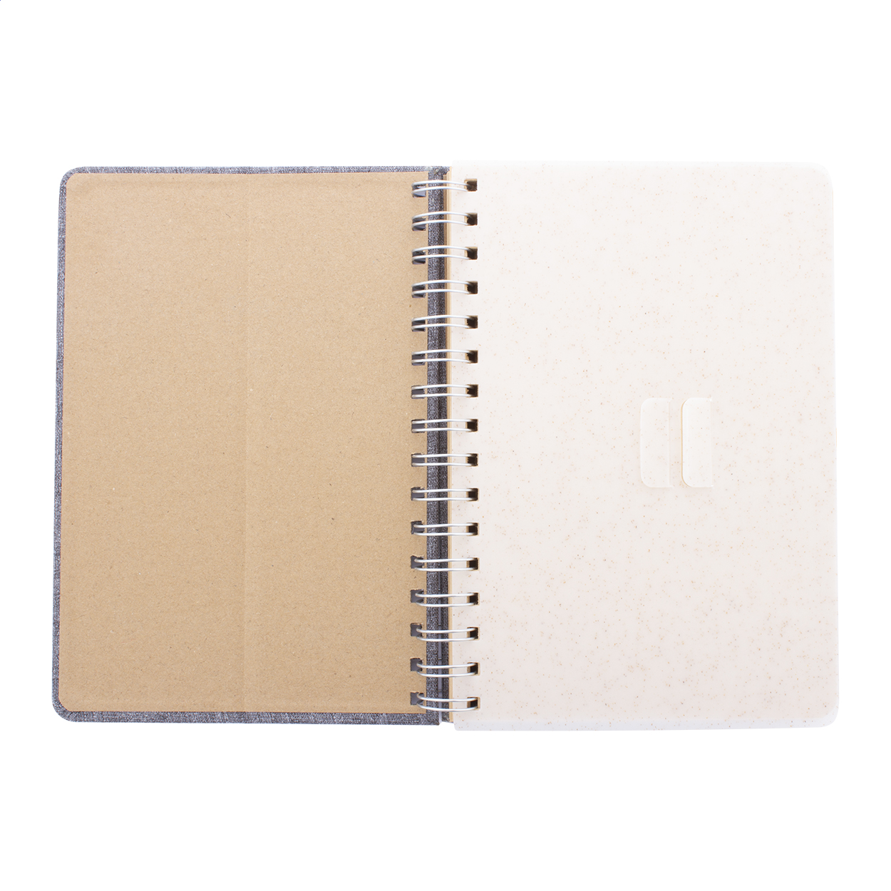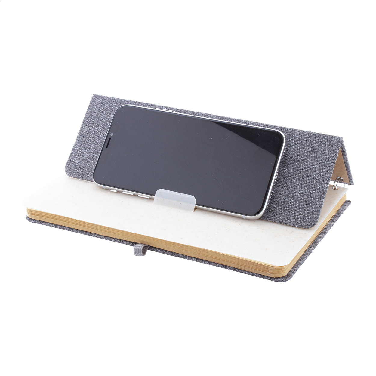 Spirálový blok A5 s deskami potaženými polyesterem RPET s plastovým držákem na mobil a tablet z pšeničné slámy. Se 70 linkovanými listy z recyklovaného kraftového papíru, gumičkou a držákem na pero.