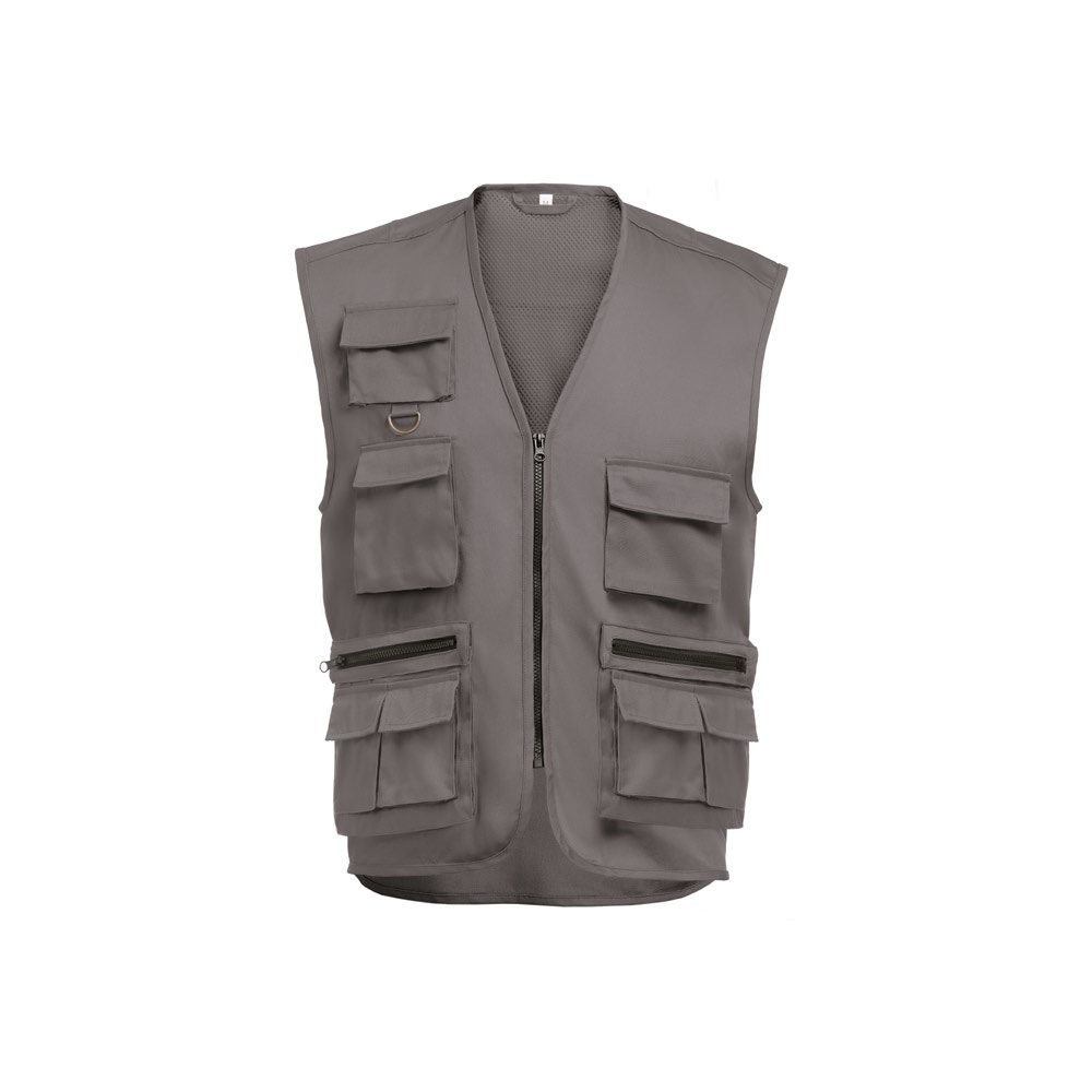 Vícekapsová prošívaná vesta (220 g/m²), z polyesteru (100 %). Se zapínáním na zip, skrytá knoflíkovou légou. Elastický pas na boku a větrovka v průramku. Se sedmi kapsami (1 náprsní kapsa, 2 spodní kapsy, 2 boční kapsy a 1 měchová kapsa na hrudi)