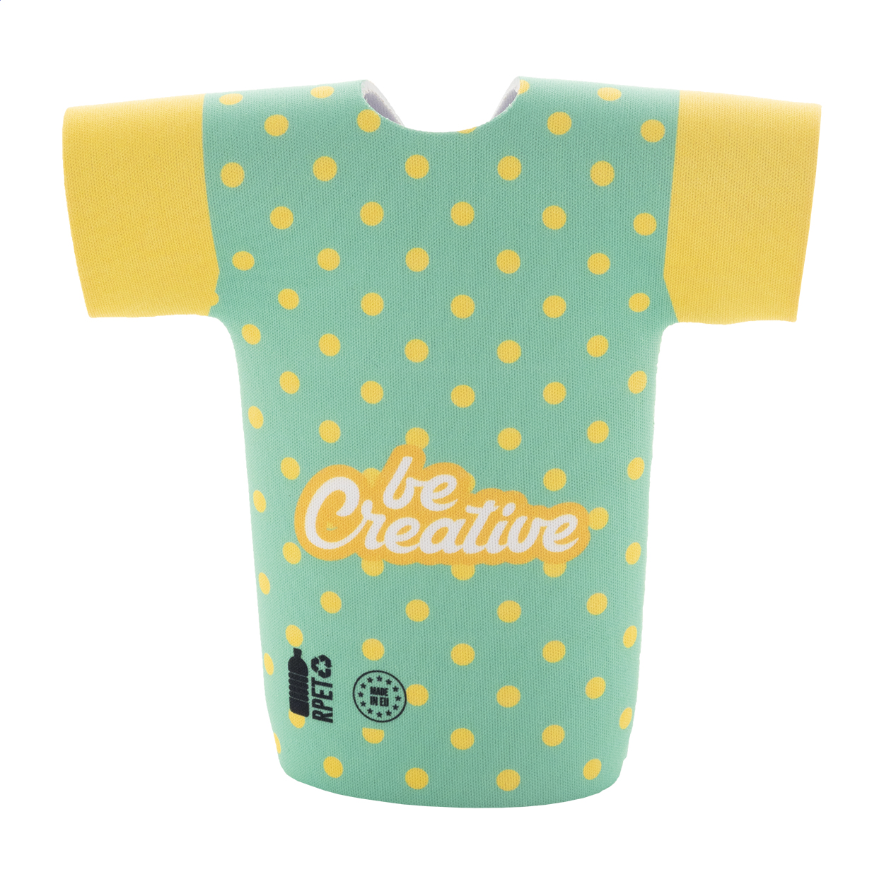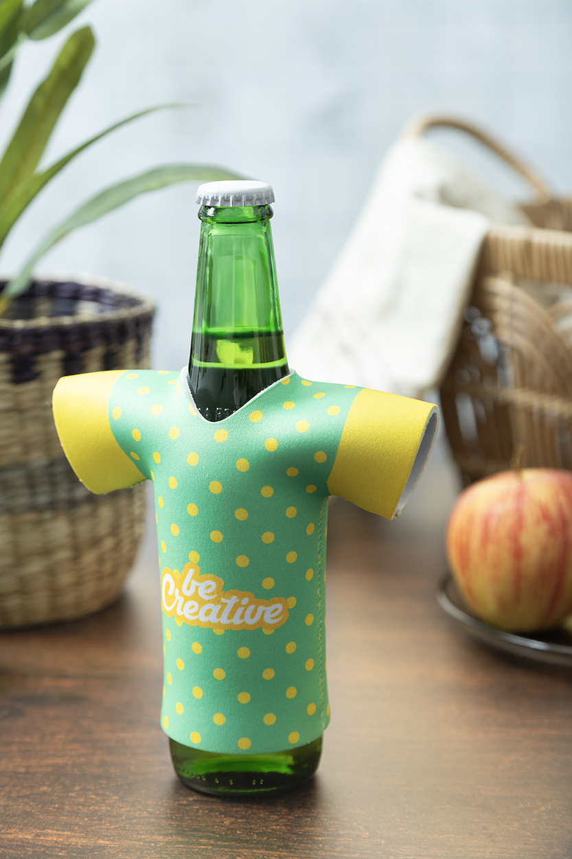 Na zakázku vyrobený RPET neoprenový chladící obal na pivní láhev ve tvaru trička. S celoplošnou sublimační tištěnou grafikou, cena nezahrnuje tiskovou přípravu. Min. mn.: 50 ks.