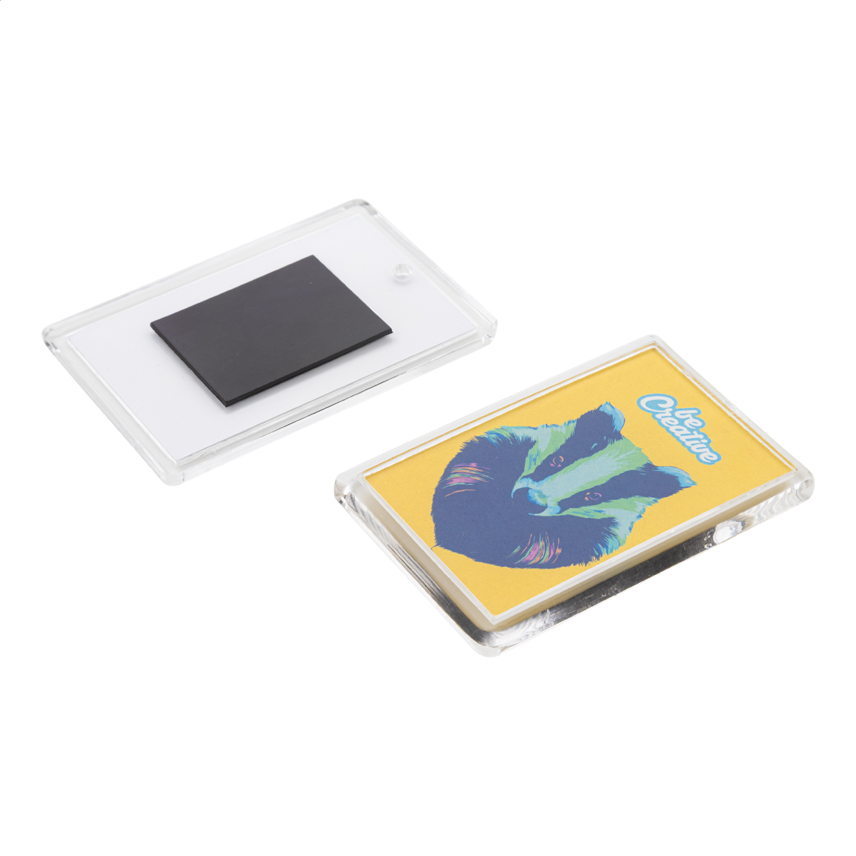 Obdélníkový akrylový magnet na ledničku s plnobarevnou papírovou vložkou na zakázku. Cena zahrnuje digitální tisk, cena nezahrnuje tiskovou přípravu. Min. mn.: 100 ks.