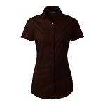 Dámská košile z jemného strečového materiálu s projmutým střihwm s bočními švy. Košile má dvojité sedlo na zadním dílu, pasové a prsní záševky a dvoudílný košilový límec. Přední kraje jsou začištěny légou. Perleťové knoflíčky v barvě materiálu (1 náhradní navíc). Košile má tvarovaný dolní kraj.