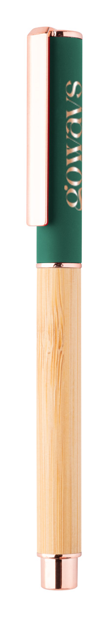 Roller pero z bambusu a recyklovaného hliníku s pogumovaným uzávěrem a detaily z růžového zlata. Se speciální povrchovou úpravou pro zrcadlové laserové gravírování v barvě růžového zlata. S modrou náplní.