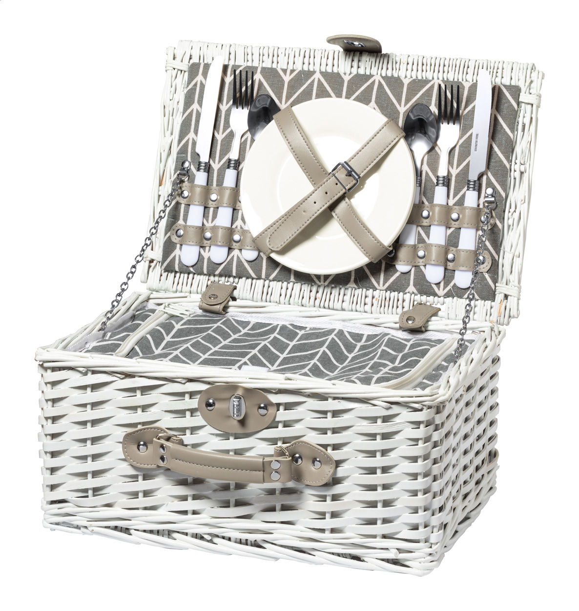 Proutěný piknikový koš pro 2 osoby, s hliníkovou izolací a uzamykacím páskem a rukojetí z PU kůže. Včetně 12dílné sady nádobí: 2 sady nerezových příborů (nůž, vidlička a lžíce), 2 keramické talíře, 2 plastové sklenice a 2 slánky.