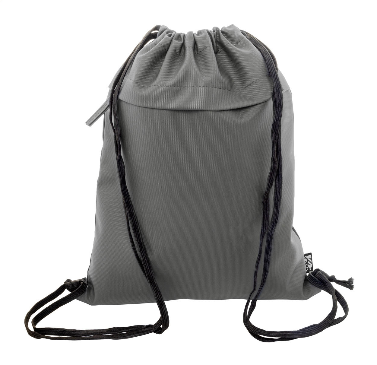 RPET vak se stahovací šňůrkou,s přední stranou potaženou PU a přední kapsou na zip. Polyester 600D RPET potažený PU s výrazným štítkem RPET.