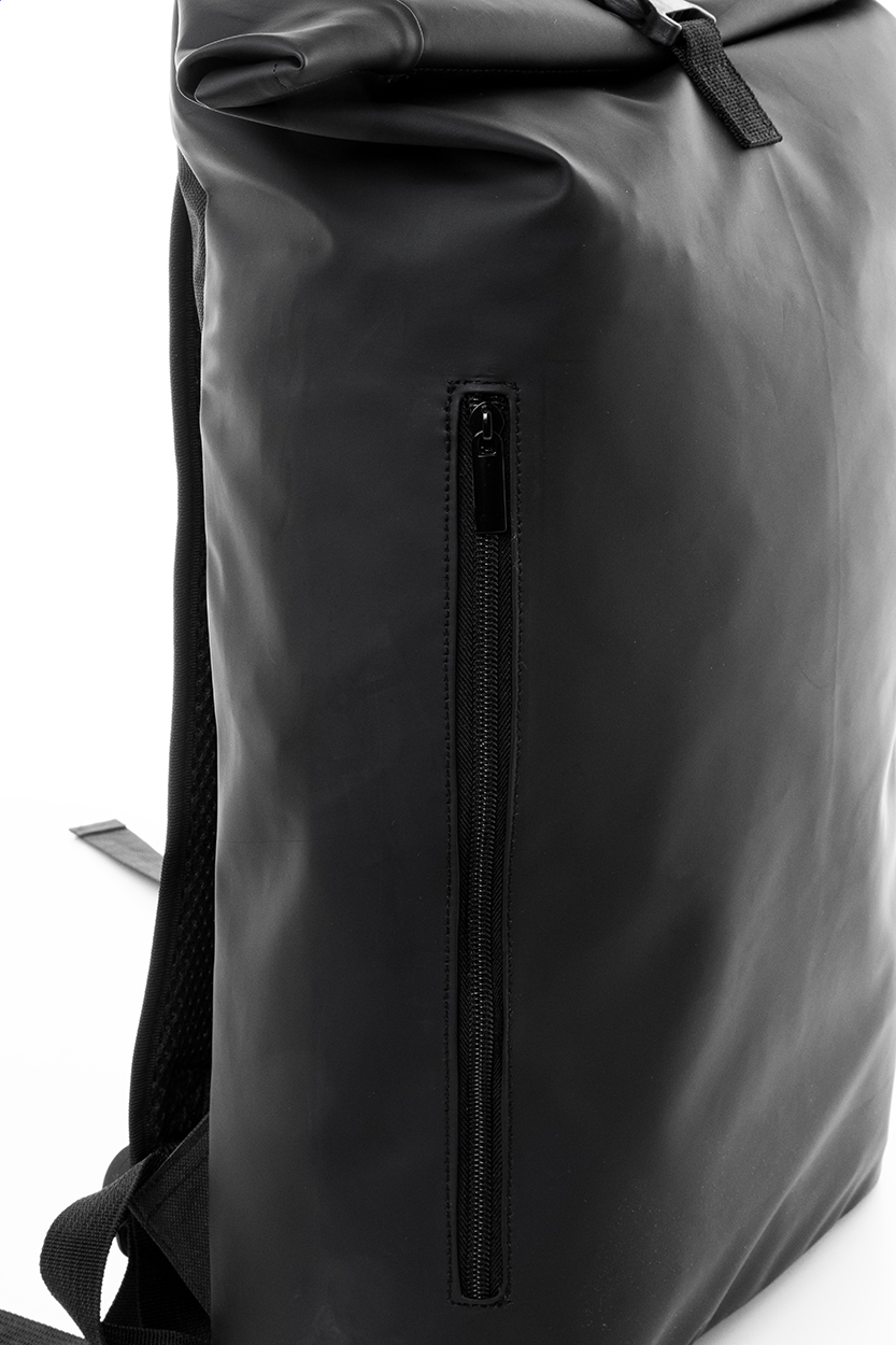 Vodotěsný, měkký rolovací batoh z recyklované PU kůže se zapínáním na přezku, přední kapsou na zip a polstrovanou přihrádkou na notebook (15"). S polstrovanými zády a ramenními popruhy. S výrazným recyklovaným PU štítkem.