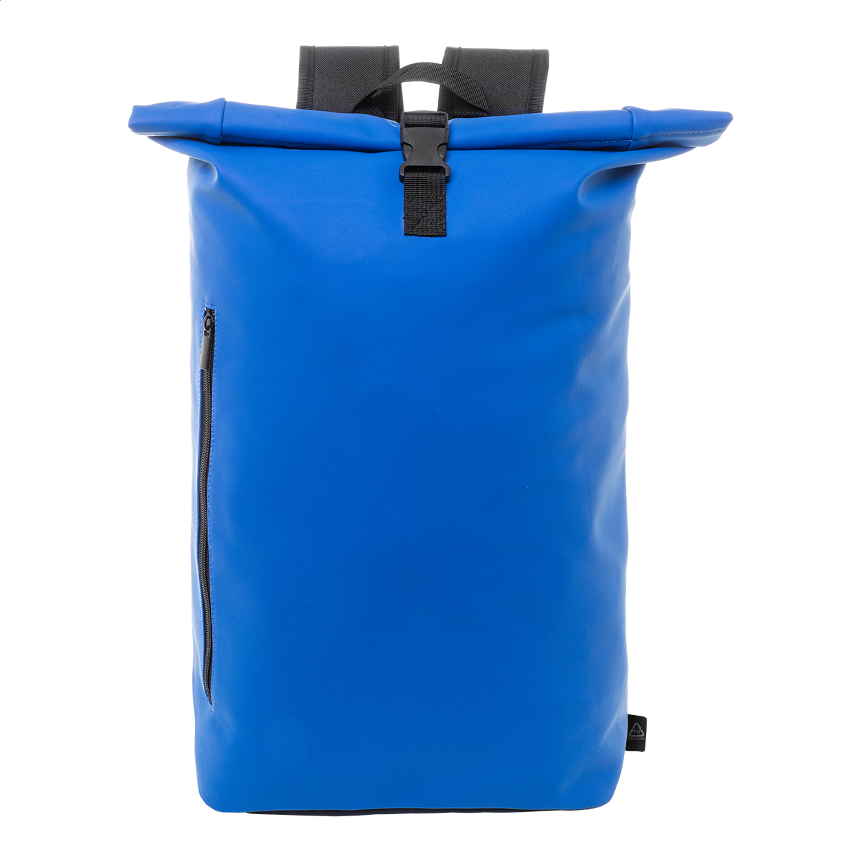 Vodotěsný, měkký rolovací batoh z recyklované PU kůže se zapínáním na přezku, přední kapsou na zip a polstrovanou přihrádkou na notebook (15"). S polstrovanými zády a ramenními popruhy. S výrazným recyklovaným PU štítkem.