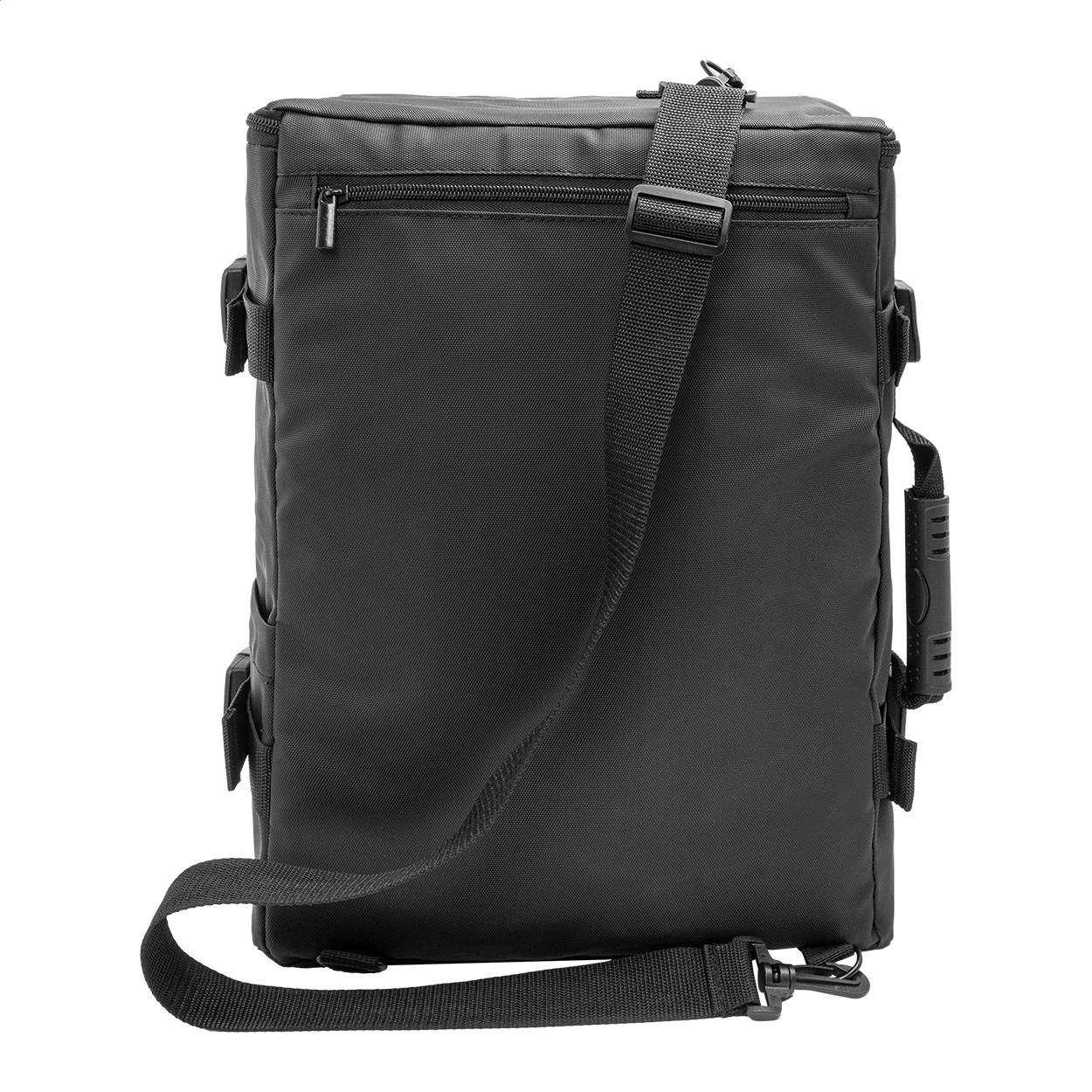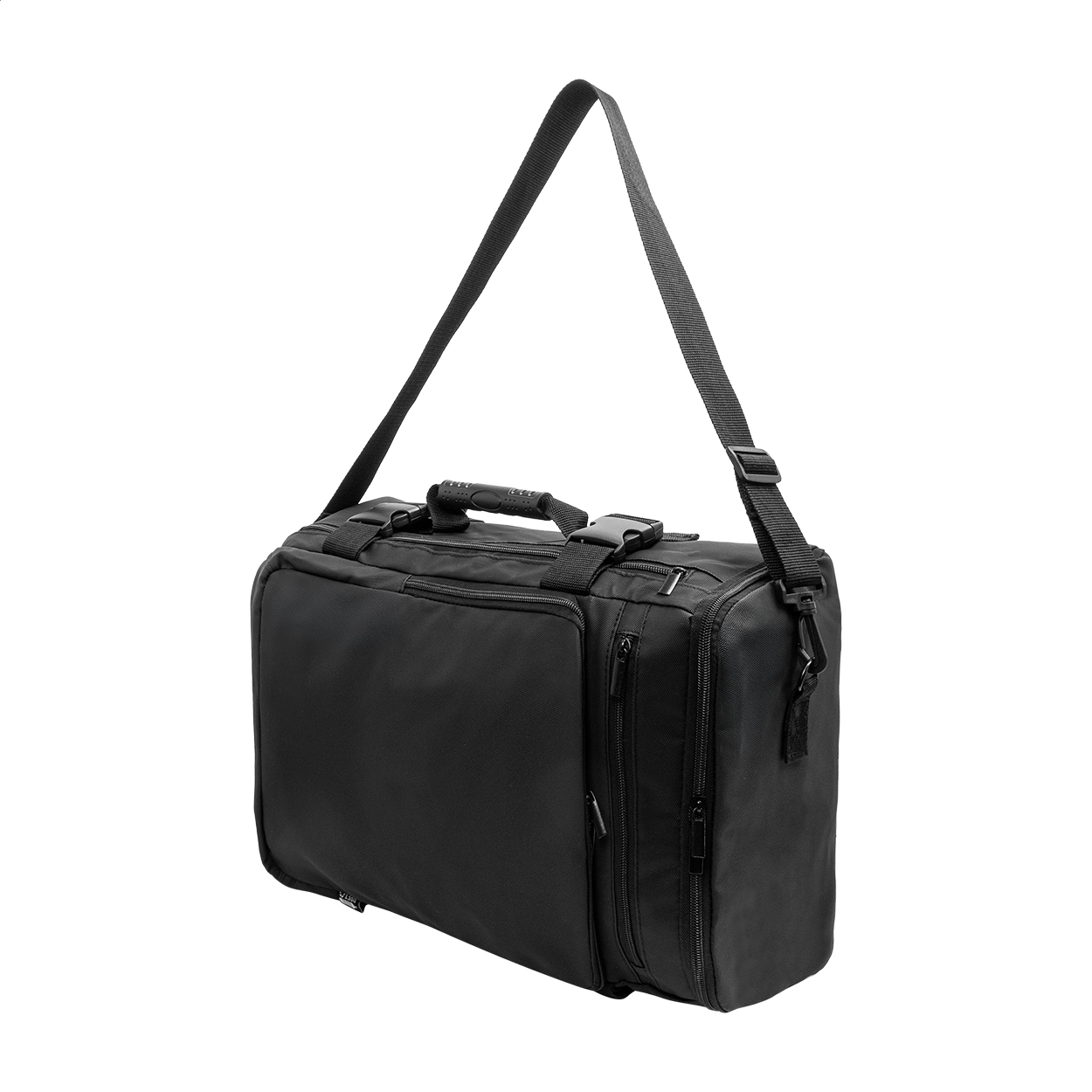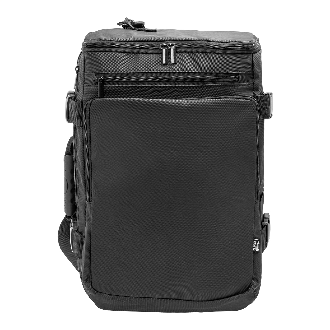 Voděodolný batoh a taška na dokumenty z RPET s dvojitou funkcí, hlavní přihrádkou na zip, dvěma předními kapsami na zip, boční kapsou, bočními popruhy s přezkou a polstrovanou přihrádkou na notebook (15"). S polstrovanými zády a odnímatelnými ramenními popruhy. Součástí je i další odnímatelný ramenní popruh pro použití jako taška na dokumenty. Polyester 600D RPET s PU zátěrem a výrazným štítkem RPET.