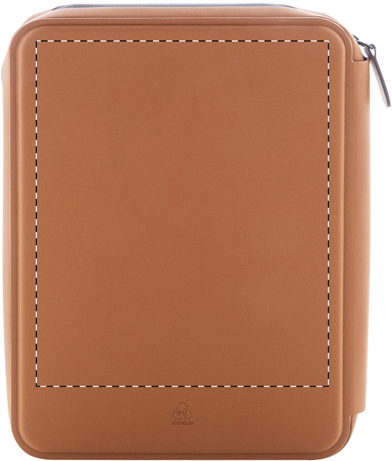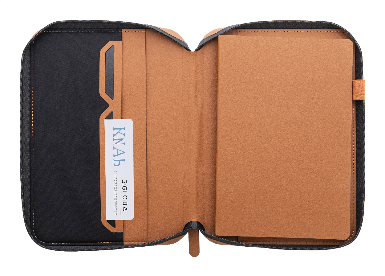 Luxusní složka na dokumenty A5 na zip z recyklované umělé kůže s 64 linkovanými listy a blokem z recyklovaného papíru. S několika vnitřními kapsami na karty a dokumenty.