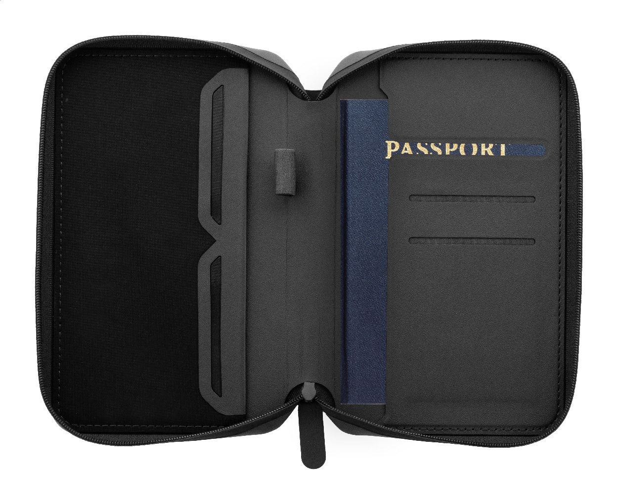 Luxusní cestovní organizér a pouzdro na pas na zip z recyklované umělé kůže. S několika vnitřními kapsami na dokumenty, karty a cestovní nezbytnosti.