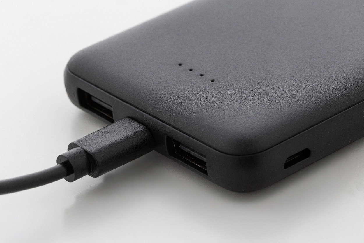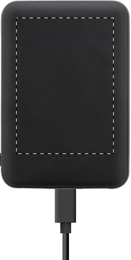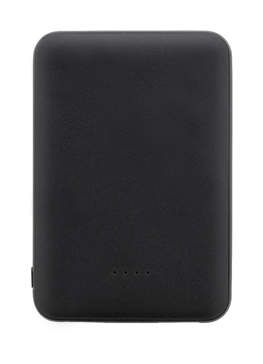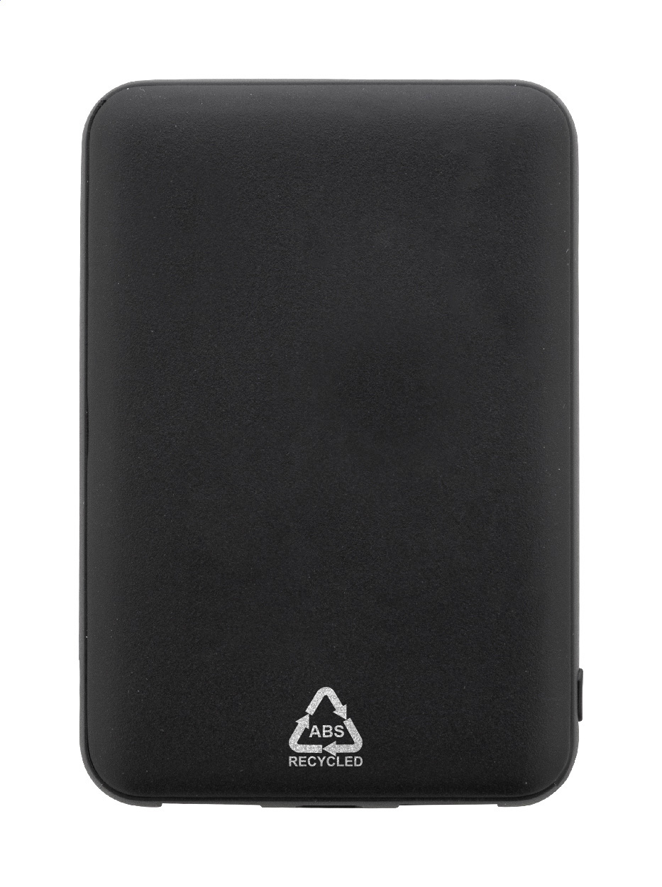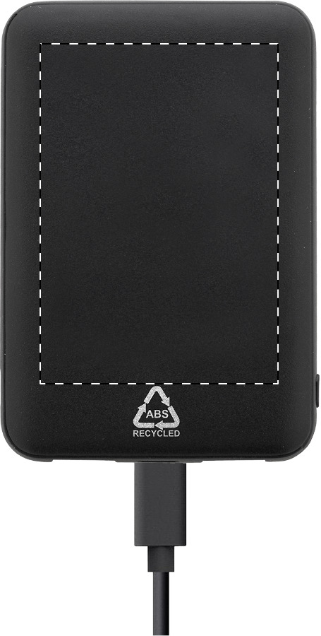 Power banka z recyklovaného ABS plastu s baterií 5 000 mAh. Se 2 USB a 1 nabíjecím portem USB-C. Vstupní porty micro USB a USB-C. Včetně nabíjecího kabelu USB.