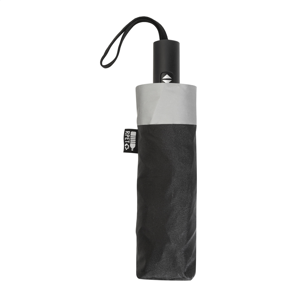 Velký, plně automatický (otevřít/zavřít) větruodolný skládací deštník se 4 panely z 190T RPET pongee a 4 panely z reflexní tkaniny. S kovovým rámem, žebry ze skelných vláken a pogumovanou rukojetí s poutkem na ruku. 190T RPET pongee. S charakteristickým štítkem RPET.