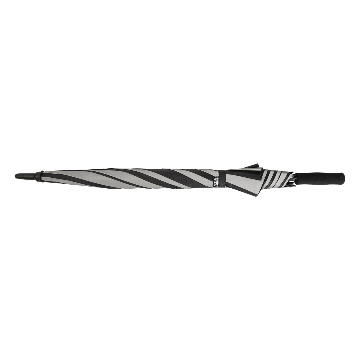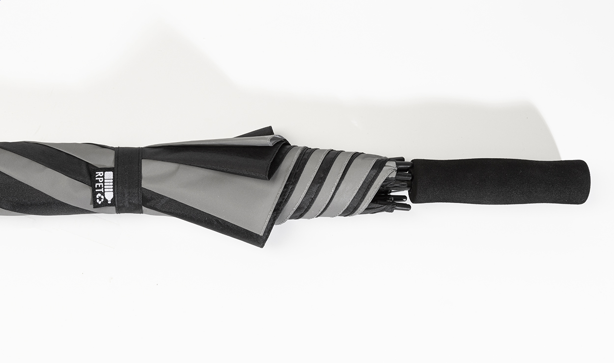 Velký, manuální větruodolný deštník se 4 panely z 190T RPET pongee a 4 panely z reflexní tkaniny. S celolaminátovým rámem a tyčí, rukojetí z EVA. 190T RPET pongee. S charakteristickým RPET štítkem.