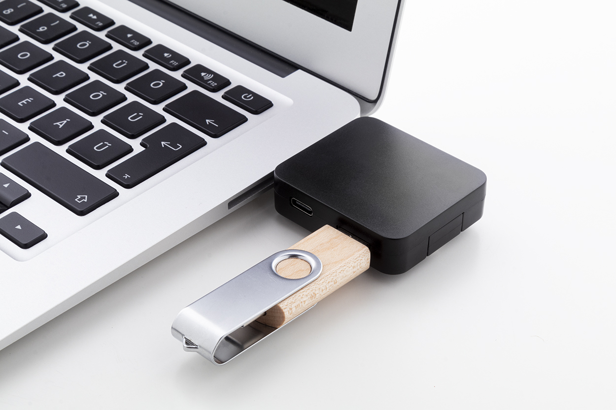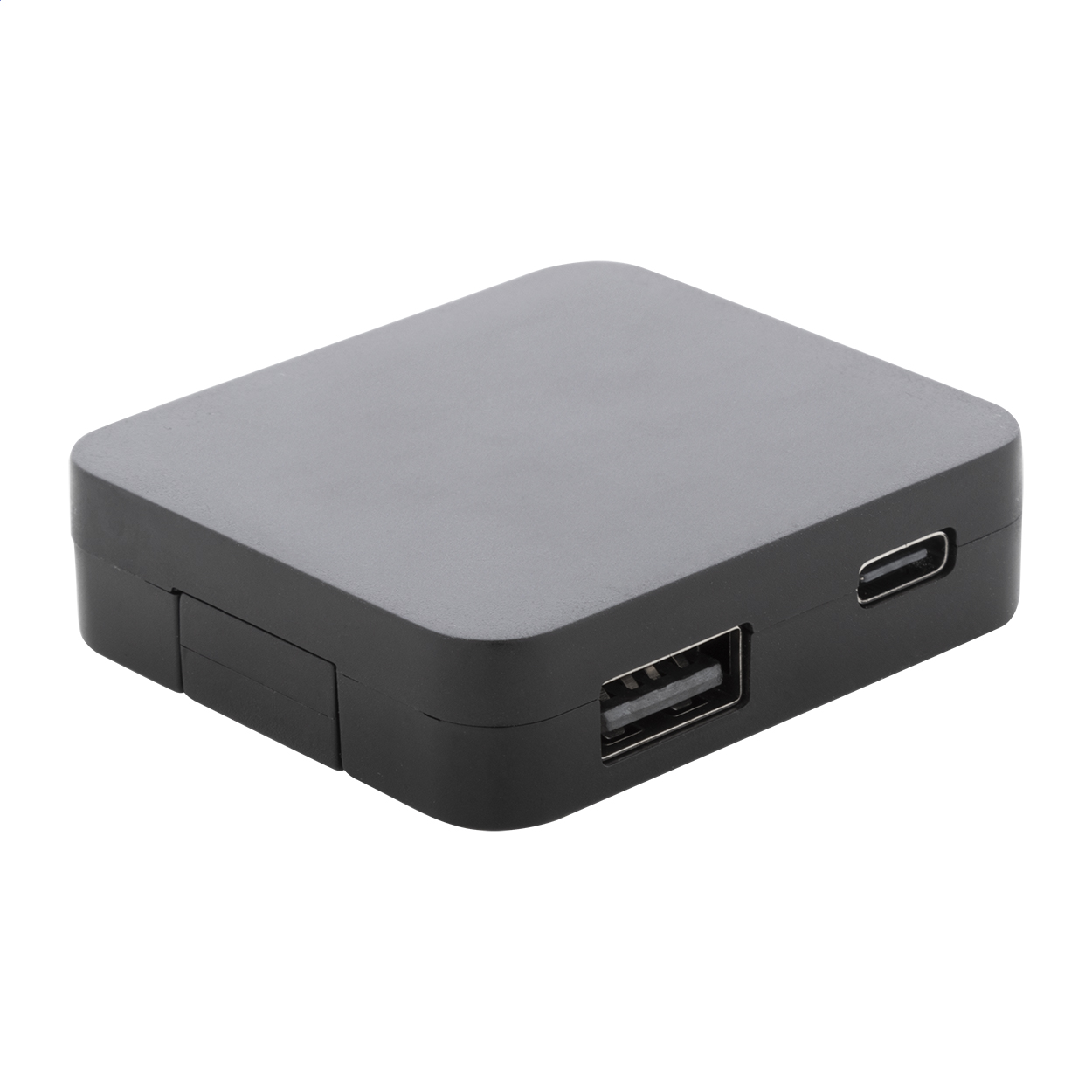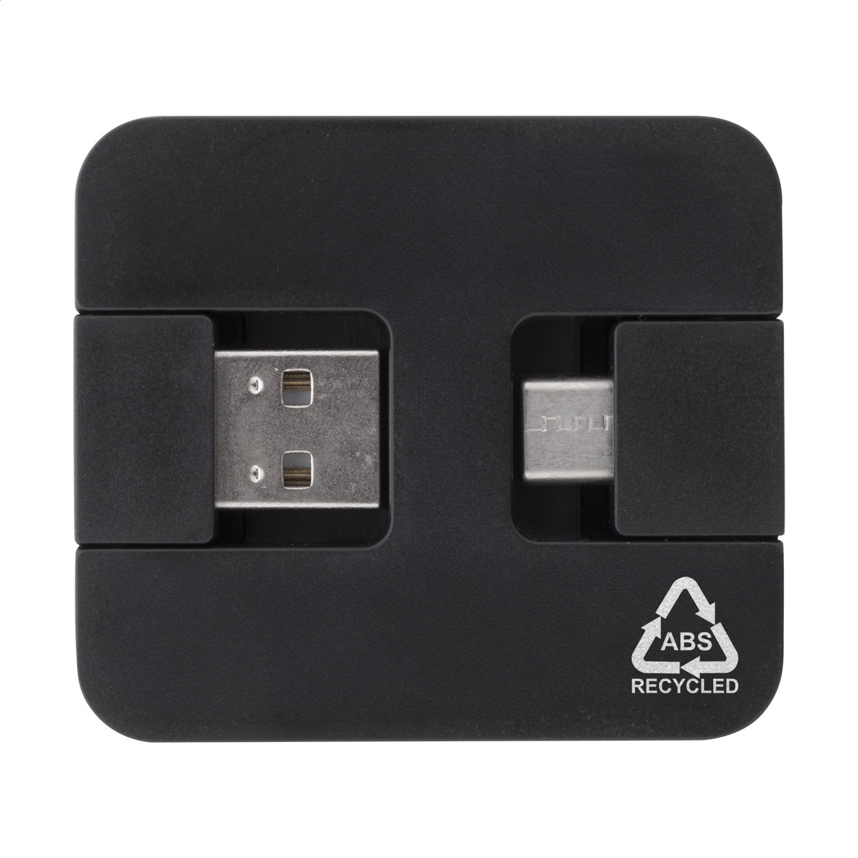 USB hub vyrobený z recyklovaného ABS plastu se 2 USB a 2 USB-C porty. Se sklopnými konektory USB a USB-C. USB 2.0.