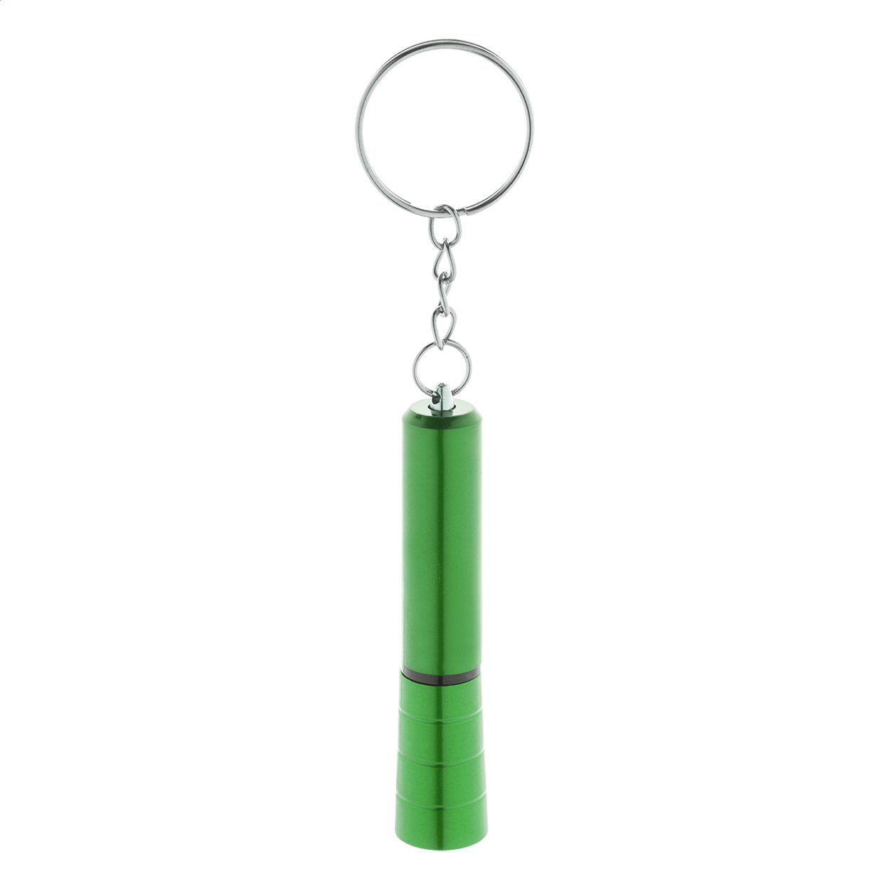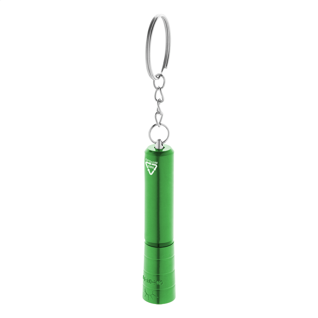 Mini baterka s 1 LED, z recyklovaného ABS plastu s kovovým povrchem a kovovým kroužkem na klíče. S knoflíkovou baterií.