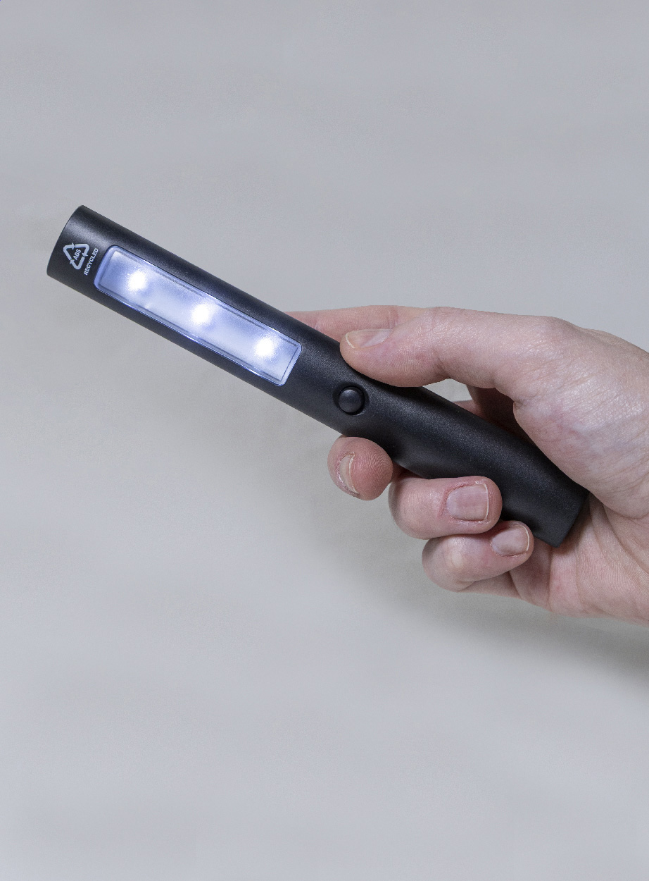 Nouzová autosvítilna z recyklovaného ABS materiálu se 3 LED diodami a magnety na zadní straně pro použití bez použití rukou. Včetně knoflíkových baterií.