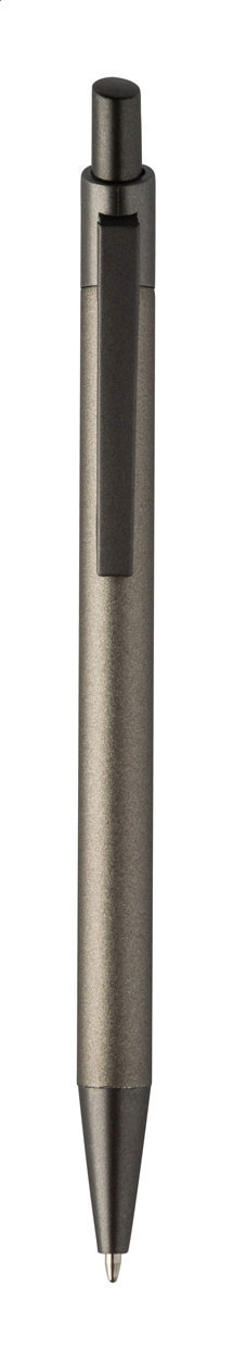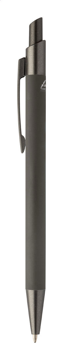 Kuličkové pero z recyklovaného hliníku s pogumovaným tělem a kovovými částmi. S modrou náplní.