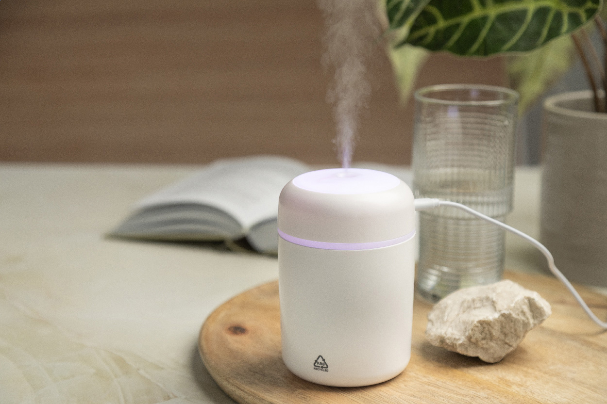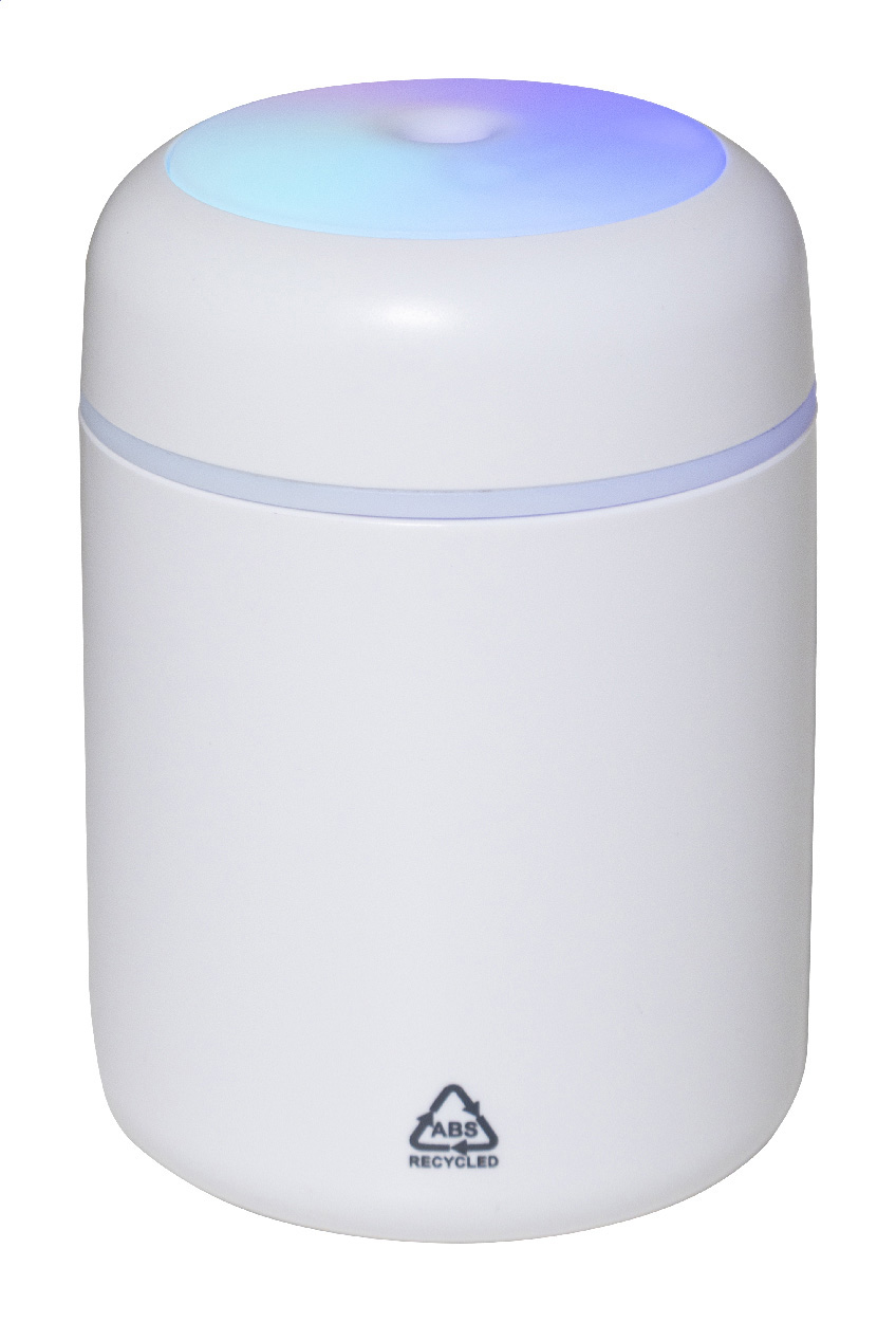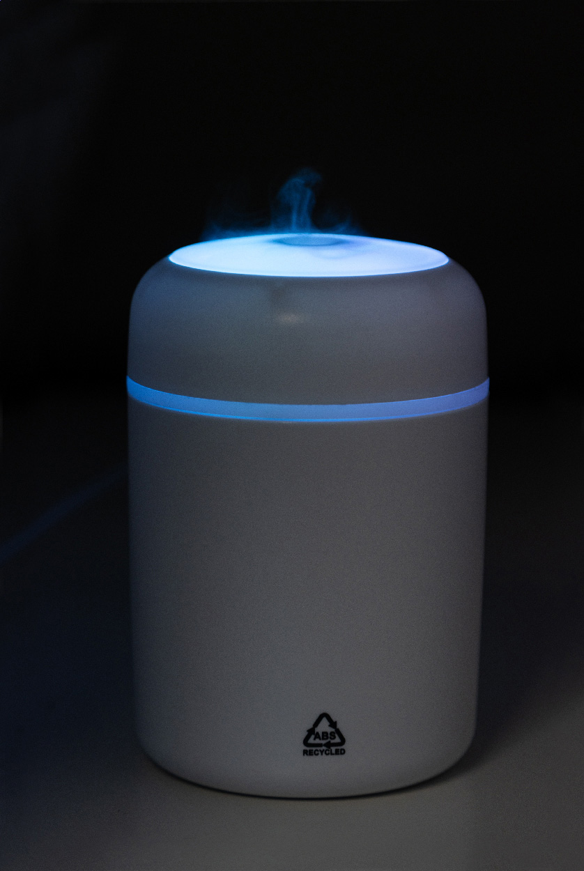Stolní zvlhčovač vzduchu z recyklovaného ABS materiálu s vícebarevným LED světlem. Včetně USB nabíjecího kabelu. Objem nádržky: 280 ml.
