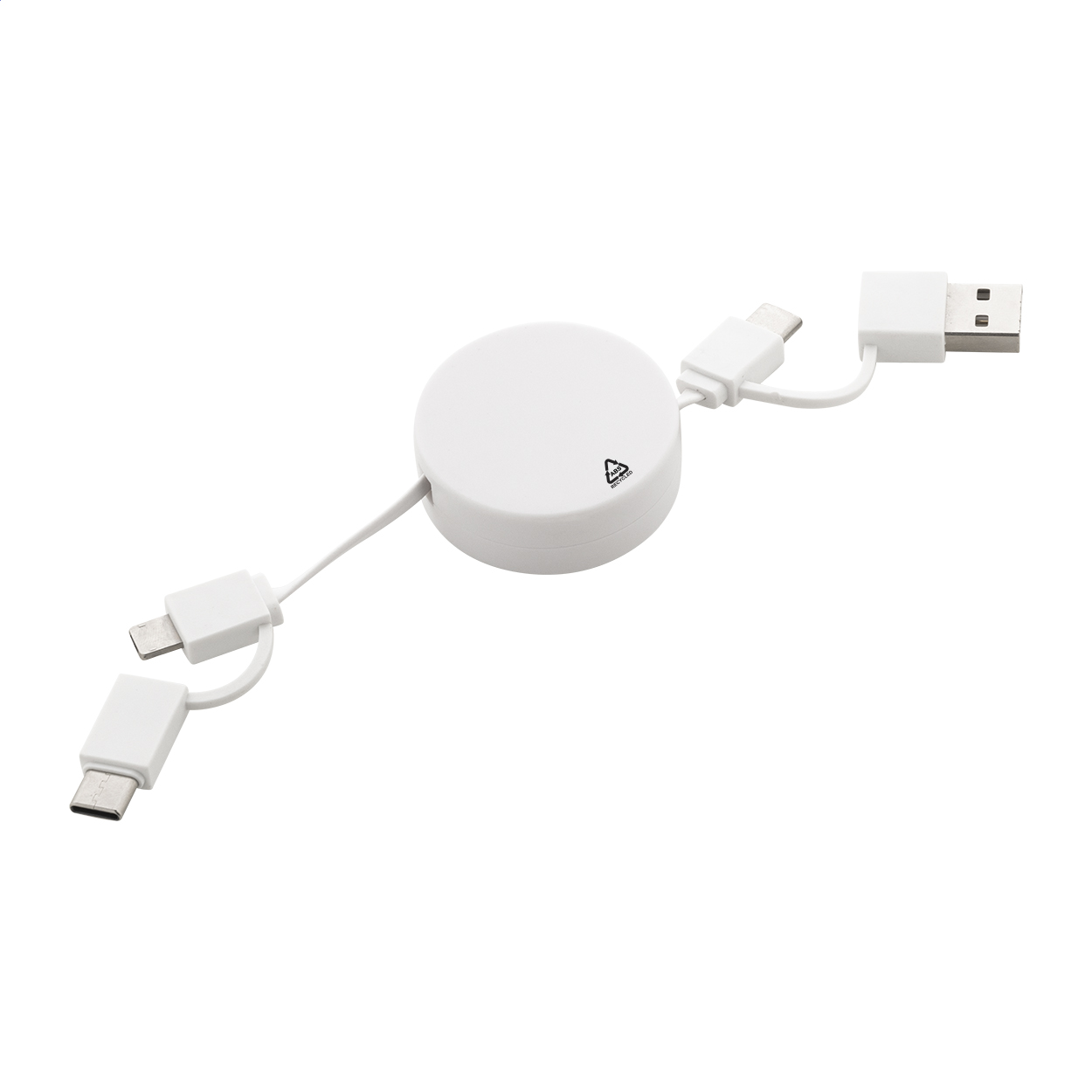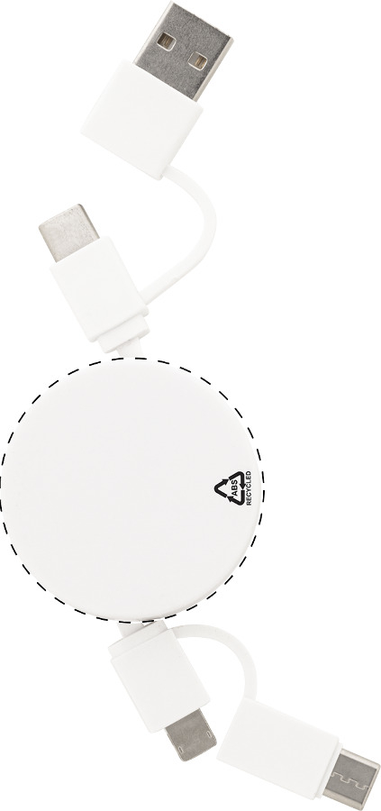 Teleskopický nabíjecí kabel USB z recyklovaného ABS s konektory micro USB, USB-C a Lightning. Se vstupy USB a USB-C.