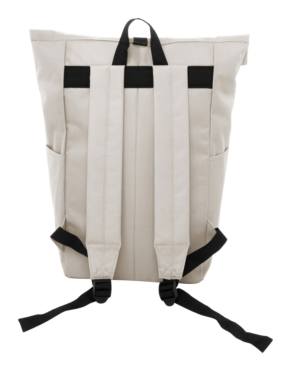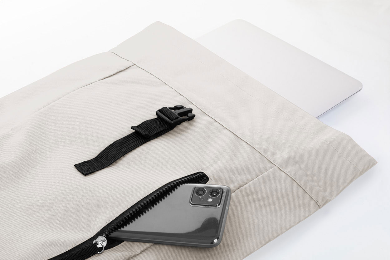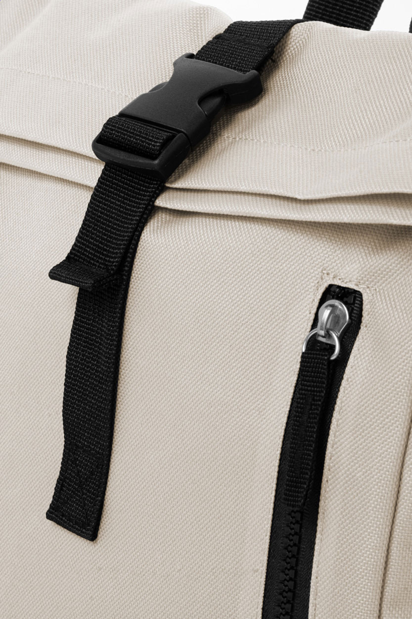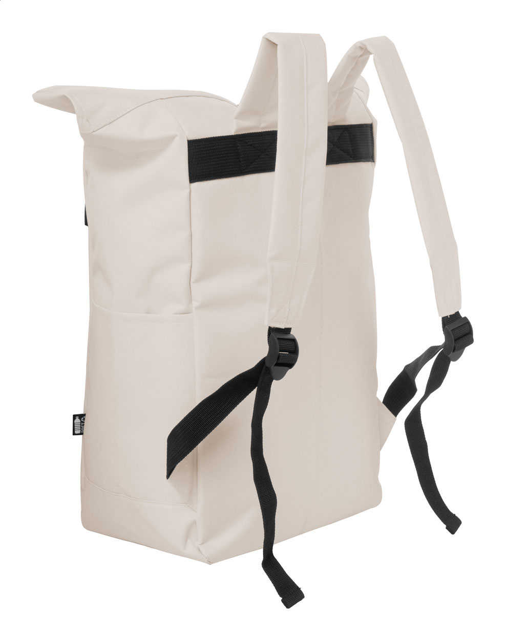 Rolovací batoh RPET se zapínáním na přezku, přihrádkou na notebook (14") a přední kapsou na zip. S polstrovanými zády a ramenními popruhy. Polyester 600D RPET s výrazným štítkem RPET.