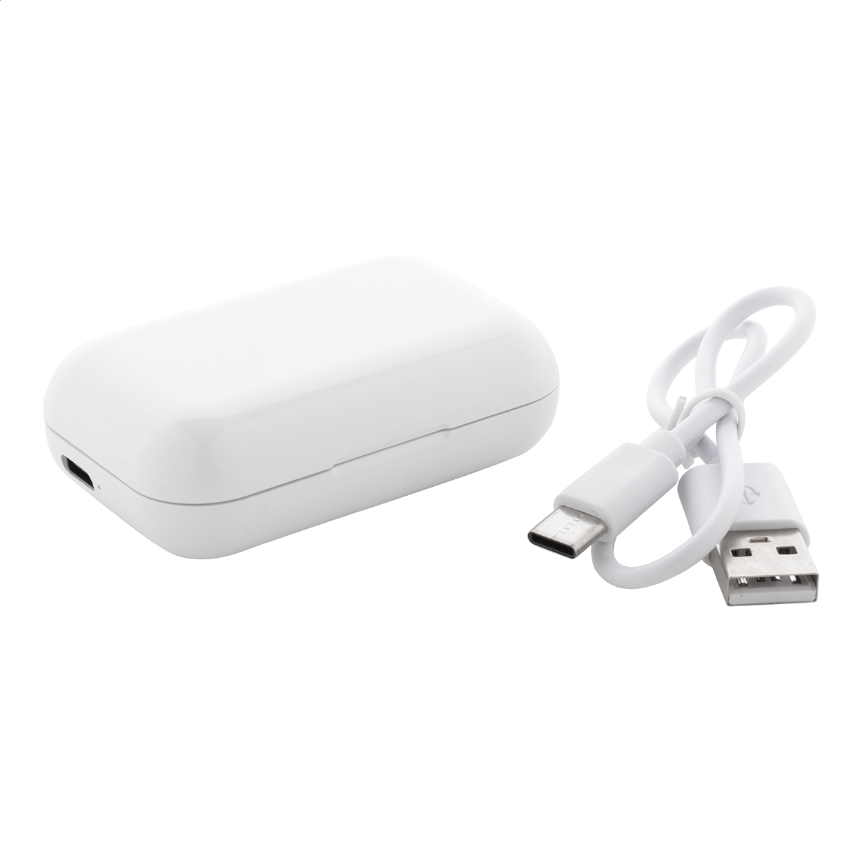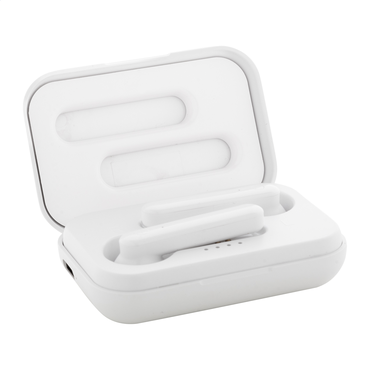 Sluchátka z recyklovaného ABS plastu s funkcí handsfree, v plastovém nabíjecím pouzdře s baterií 400 mAh. Včetně nabíjecího kabelu USB.