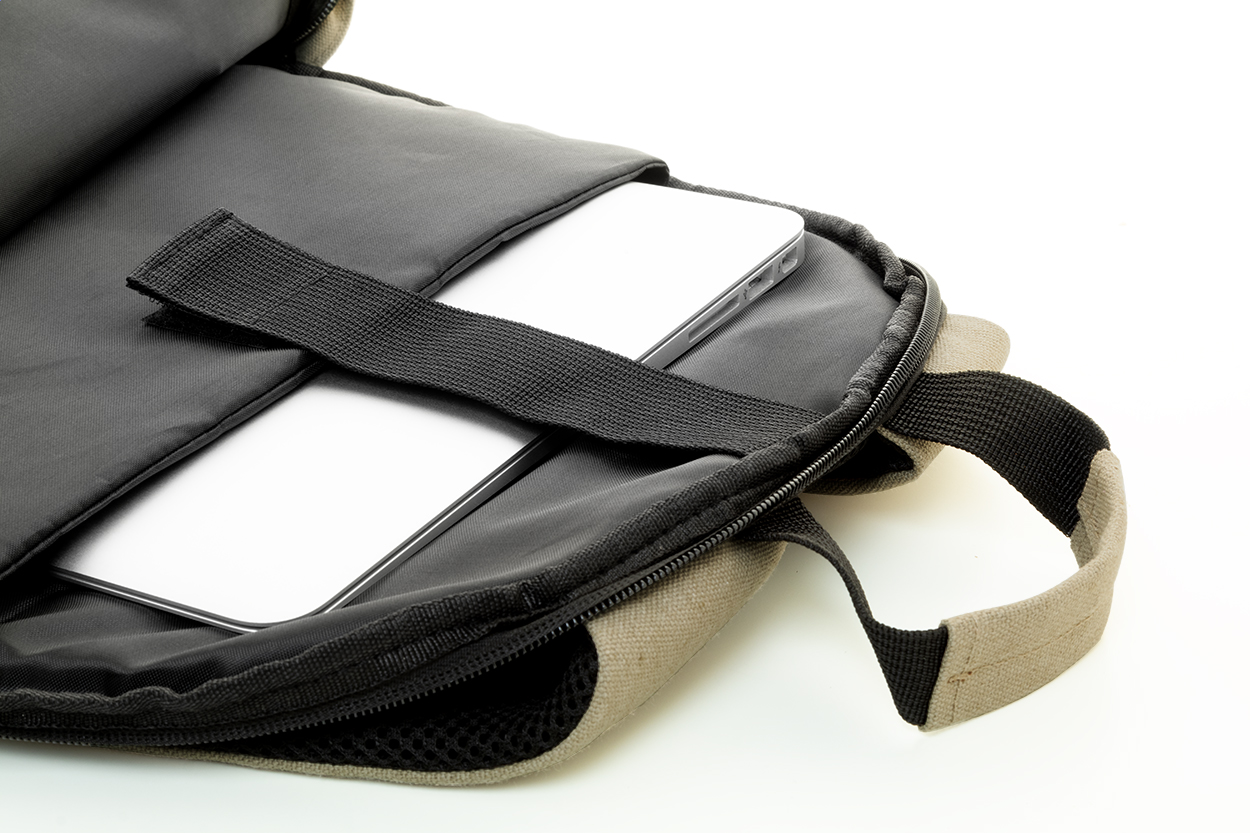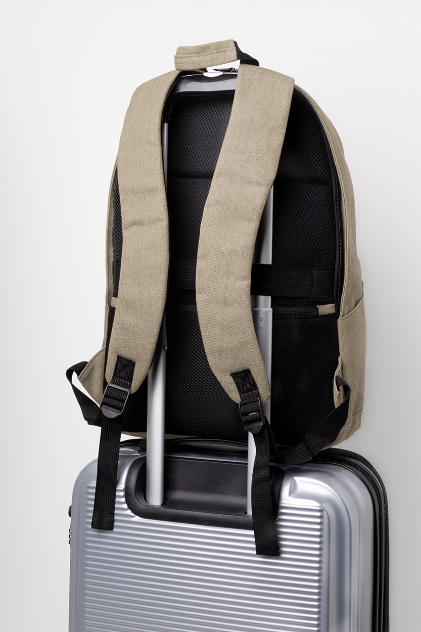 Batoh z recyklovaného plátna s hlavním oddílem na zip, polstrovanou přihrádkou na notebook (15"), přední kapsou na zip, bočními kapsami, popruhem na vozík, polstrovanými zády a ramenními popruhy. Se skrytou kapsou proti krádeži. 70% recyklované bavlny a 30% RPET polyesteru. S výrazným štítkem z recyklované bavlny.