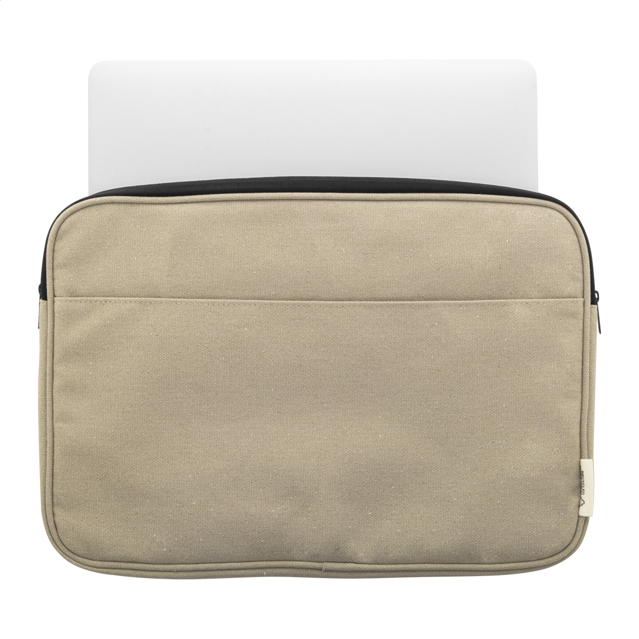 Plně polstrovaná taška na notebook z recyklovaného plátna s přihrádkou na zip a přední kapsou. Vhodné pro notebooky do 15". 70% recyklované bavlny a 30% RPET polyesteru. S výrazným štítkem z recyklované bavlny.