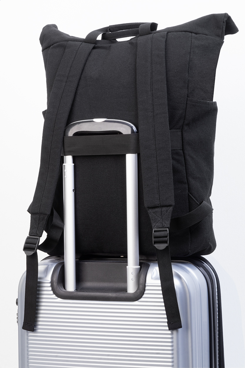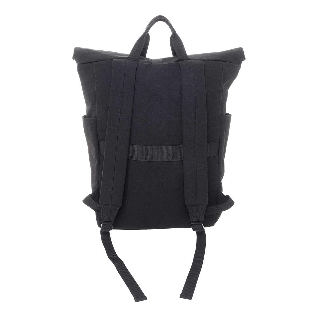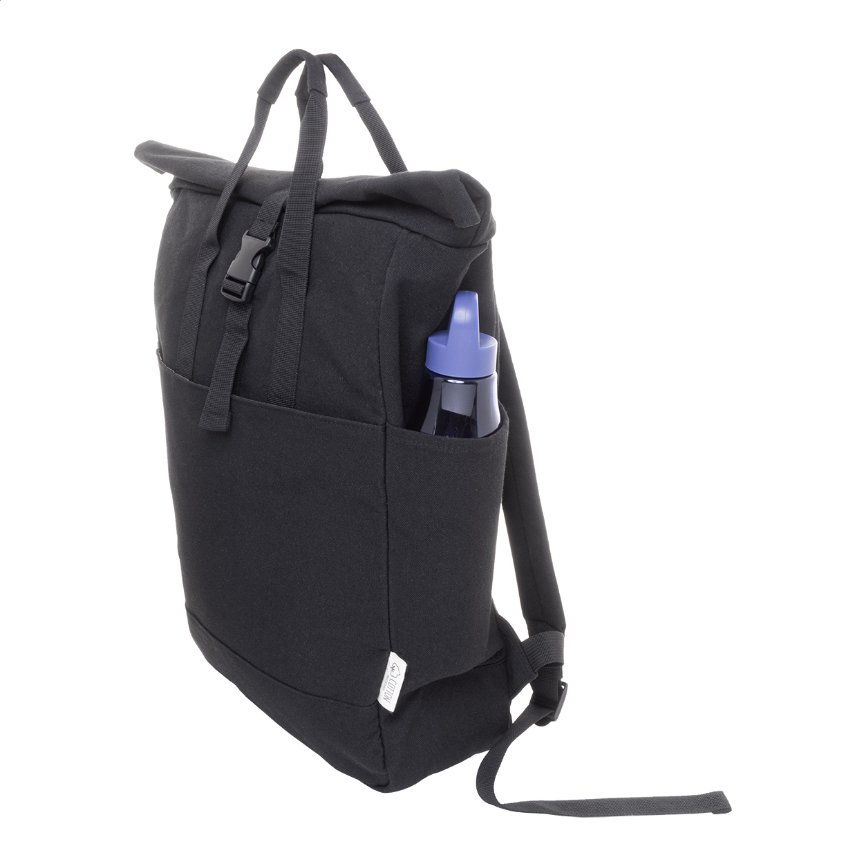 Rolovací batoh z recyklovaného plátna se zapínáním na přezku a suchý zip, polstrovaná přihrádka na notebook (15"), přední a boční kapsy. S popruhem na vozík, polstrovaná záda a ramenní popruhy. 70% recyklované bavlny a 30% RPET polyesteru. S výrazným štítkem z recyklované bavlny.
