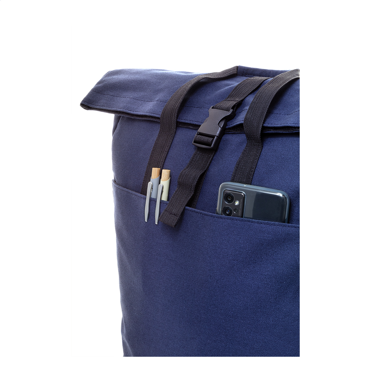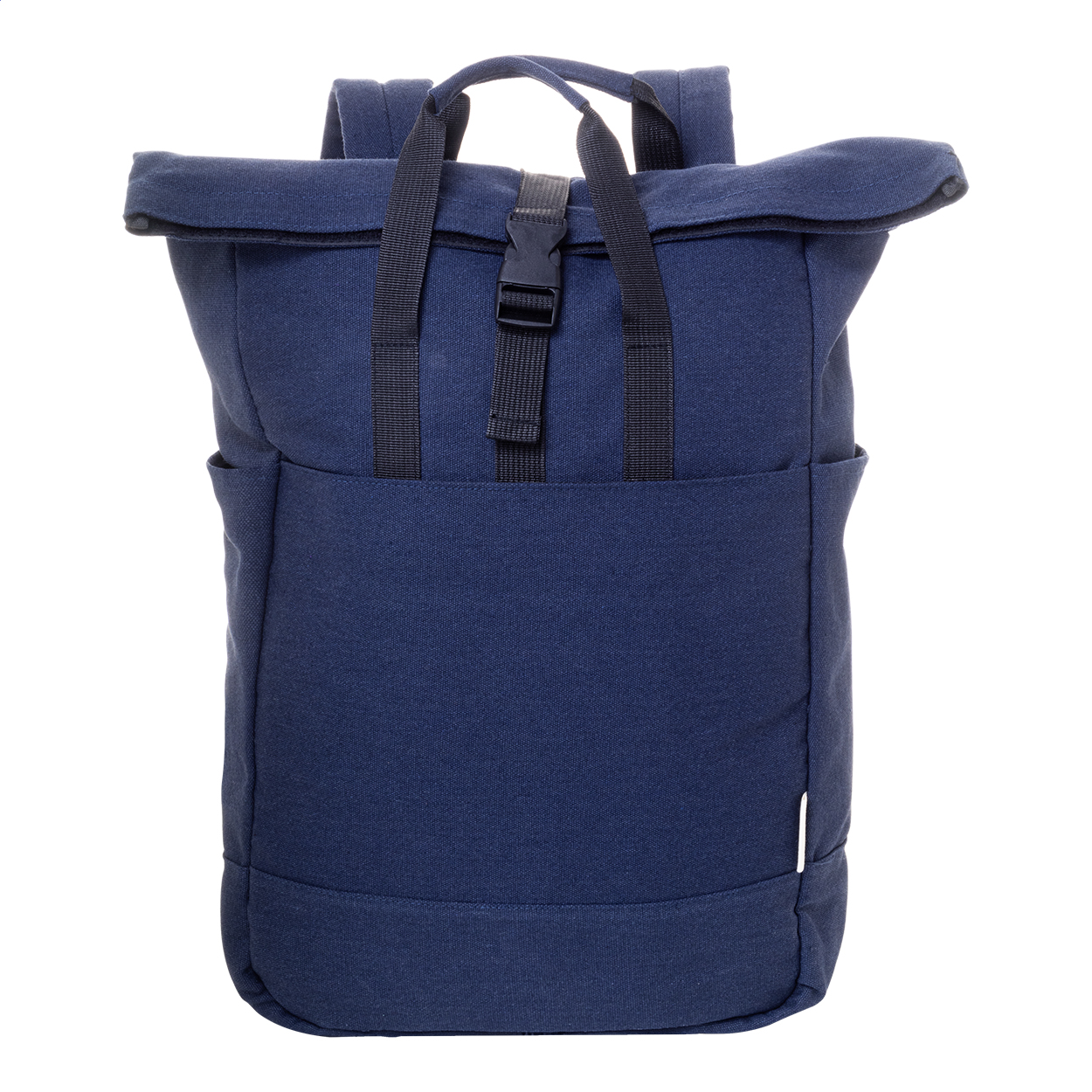 Rolovací batoh z recyklovaného plátna se zapínáním na přezku a suchý zip, polstrovaná přihrádka na notebook (15"), přední a boční kapsy. S popruhem na vozík, polstrovaná záda a ramenní popruhy. 70% recyklované bavlny a 30% RPET polyesteru. S výrazným štítkem z recyklované bavlny.