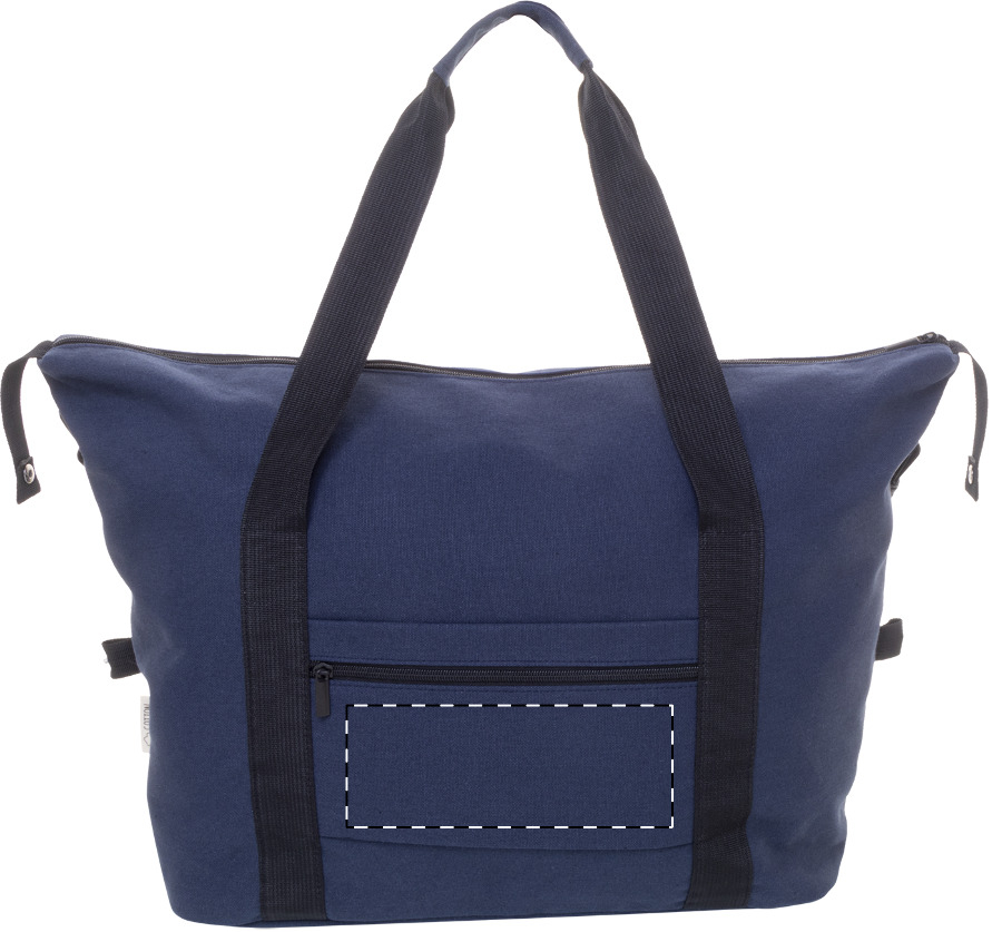 Cestovní / sportovní taška z recyklovaného plátna s hlavním oddílem na zip, přední kapsou, nastavitelným ramenním popruhem a zadní kapsou na zip, která slouží jako popruh na vozík. 70% recyklované bavlny a 30% RPET polyesteru. S výrazným štítkem z recyklované bavlny.
