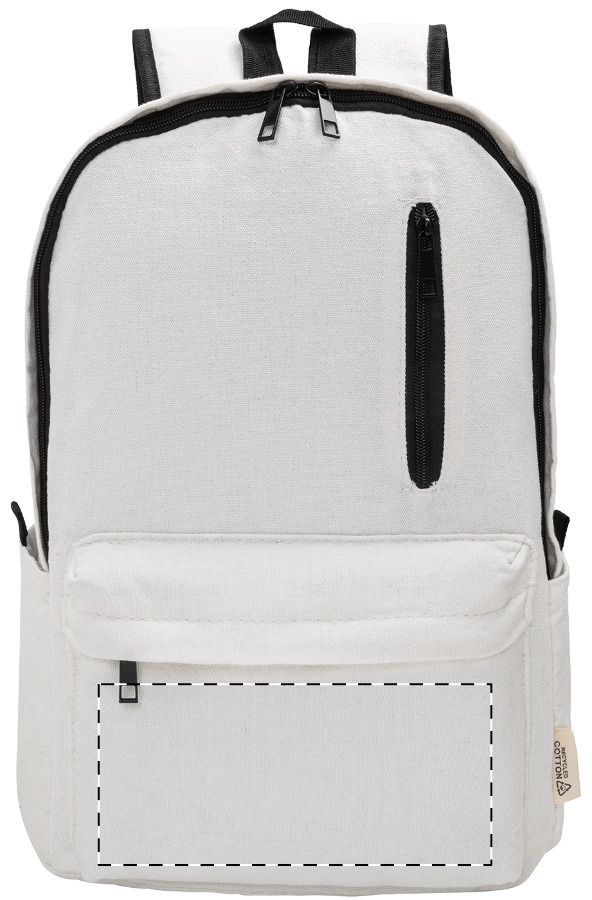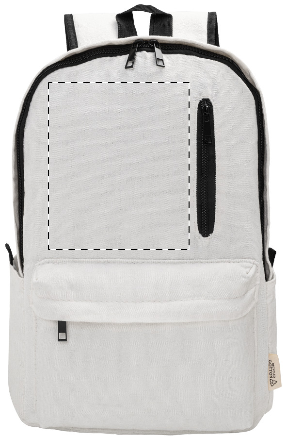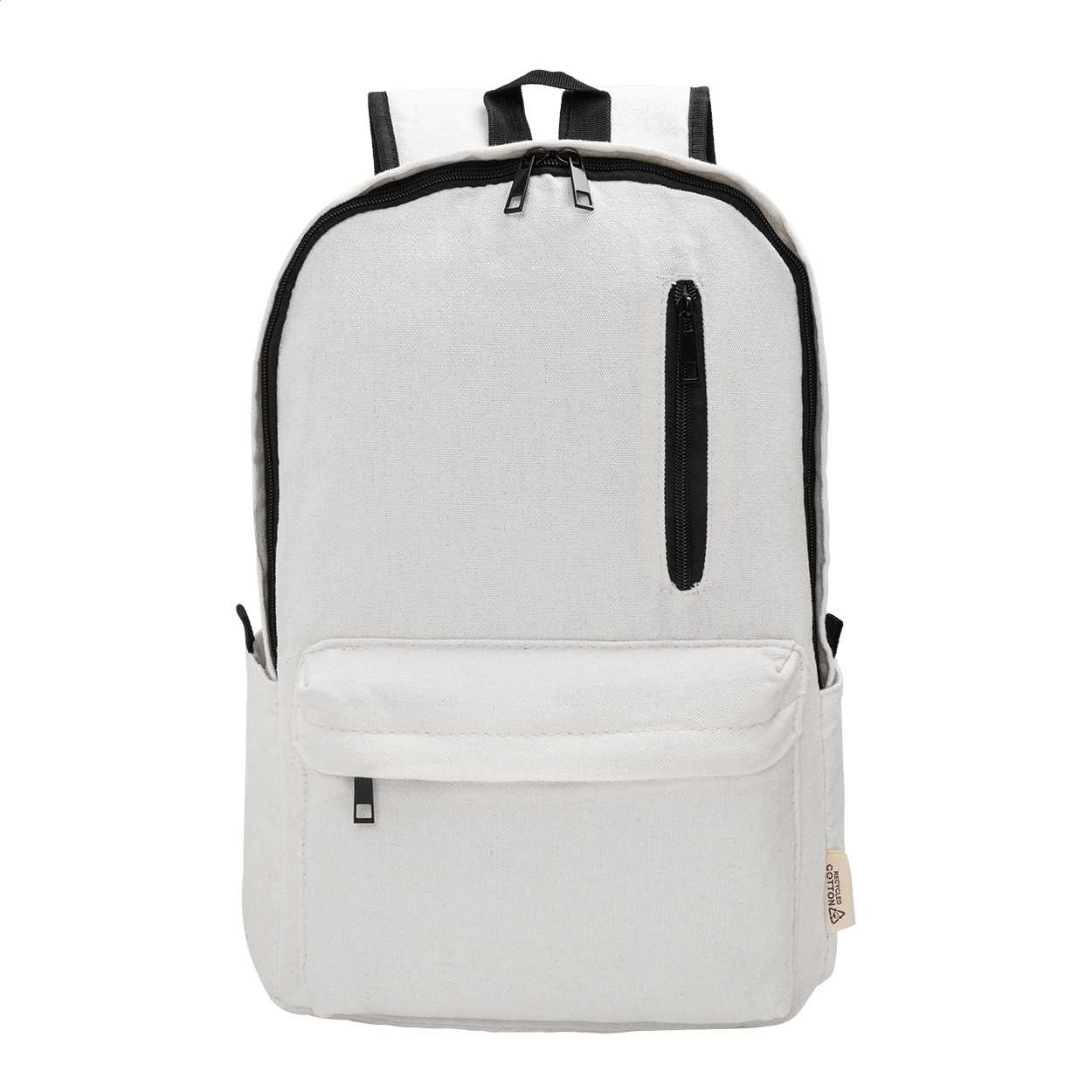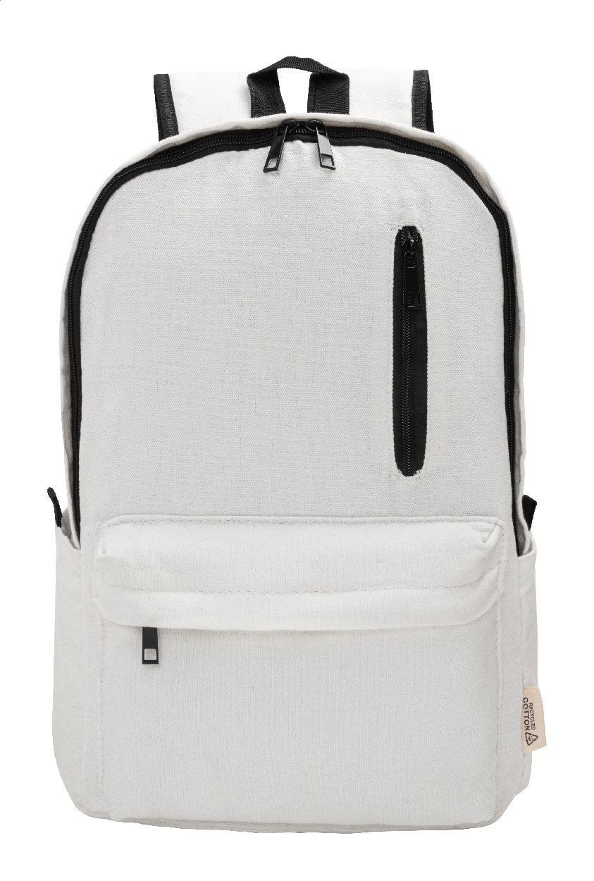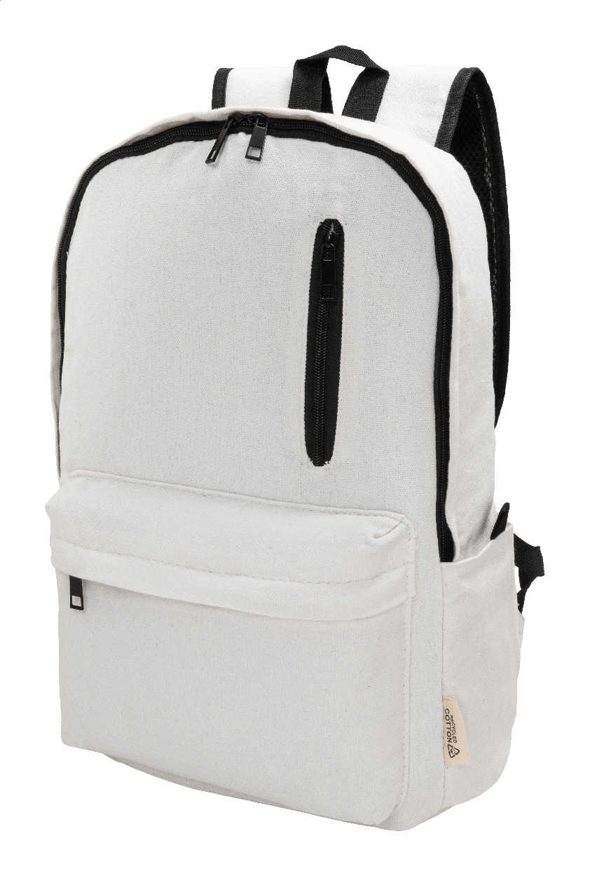 Recyklovaný plátěný batoh s hlavní přihrádkou na zip, polstrovanou přihrádkou na notebook (15"), 2 předními kapsami na zip, bočními kapsami, popruhem na kolečkách, polstrovanými zády a ramenními popruhy. 70% recyklované bavlny a 30% RPET polyesteru. S výrazným štítkem recyklované bavlny.